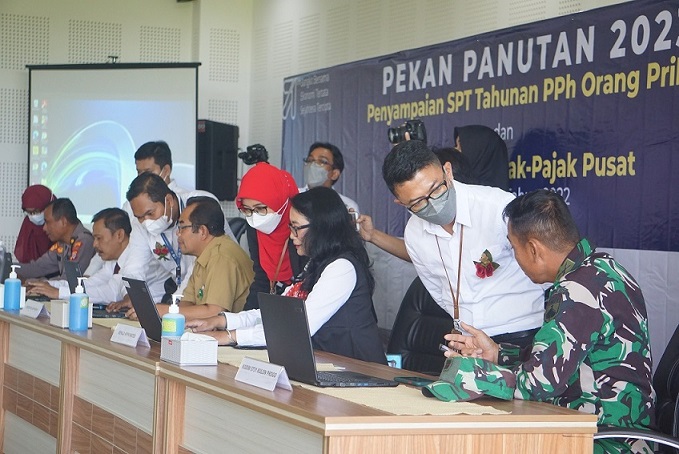 Sekretaris Daerah Kulon Progo Triyono, S.I.P., M.Si. dan para pejabat di Kabupaten Kulon Progo serta perwakilan dari Polres dan Kodim 0731/Kulon Progo, melaporkan Surat Pemberitahuan (SPT) Tahunan Pajak Penghasilan Orang Pribadi tahun 2022 melalui e-Filing didampingi oleh Plt. Kepala Kantor Pelayanan Pajak (KPP) Pratama Wates, Christijanto Wahju Purwoistijoko di Gedung Field Research Center (FRC), Sekolah Vokasi UGM, Wates, Kulon Progo (Senin, 20/2).