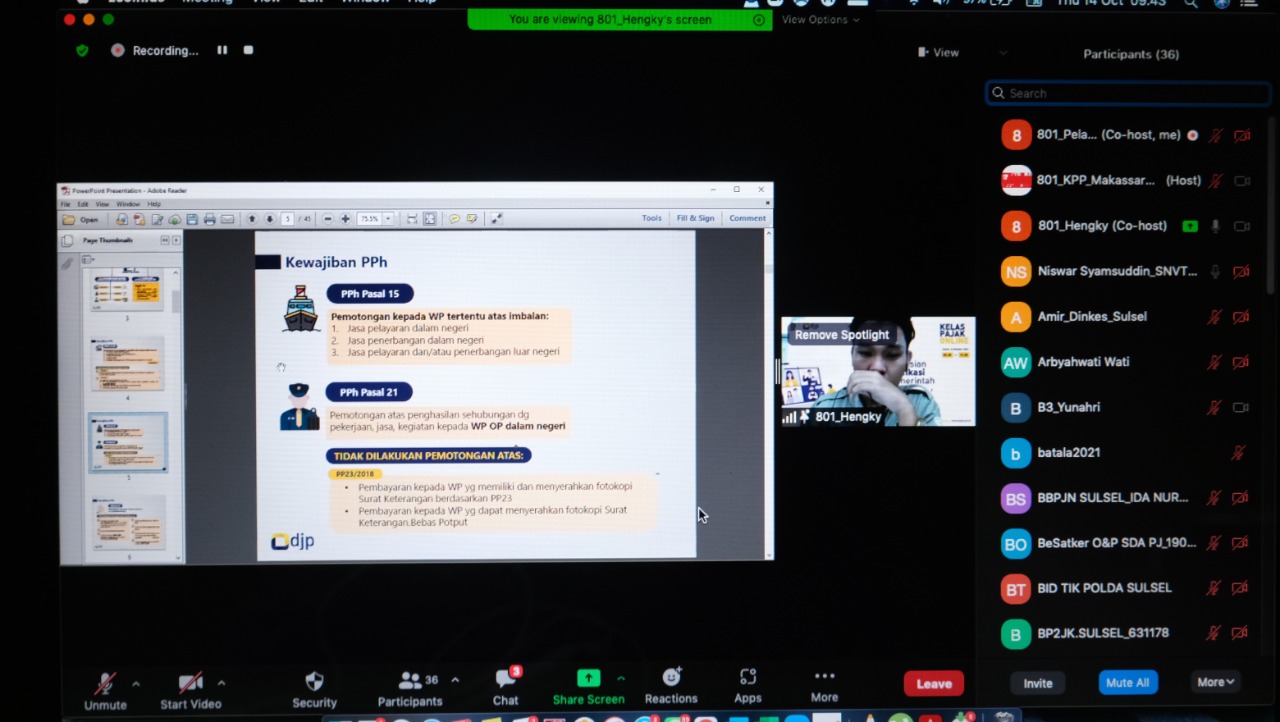 Kantor Pelayanan Pajak (KPP) Pratama Makassar Utara (Makuta) menyelenggarakan Kelas Pajak dengan tema “Tutorial Pengisian e-Bupot Unifikasi Instansi Pemerintah” yang ditujukan pada bendahara pemerintah (Kamis, 14/10). Acara ini dilaksanakan secara daring melalui aplikasi Zoom Cloud Meetings di ruang studio Makuta, KPP Pratama Makassar Utara, Kota Makassar.