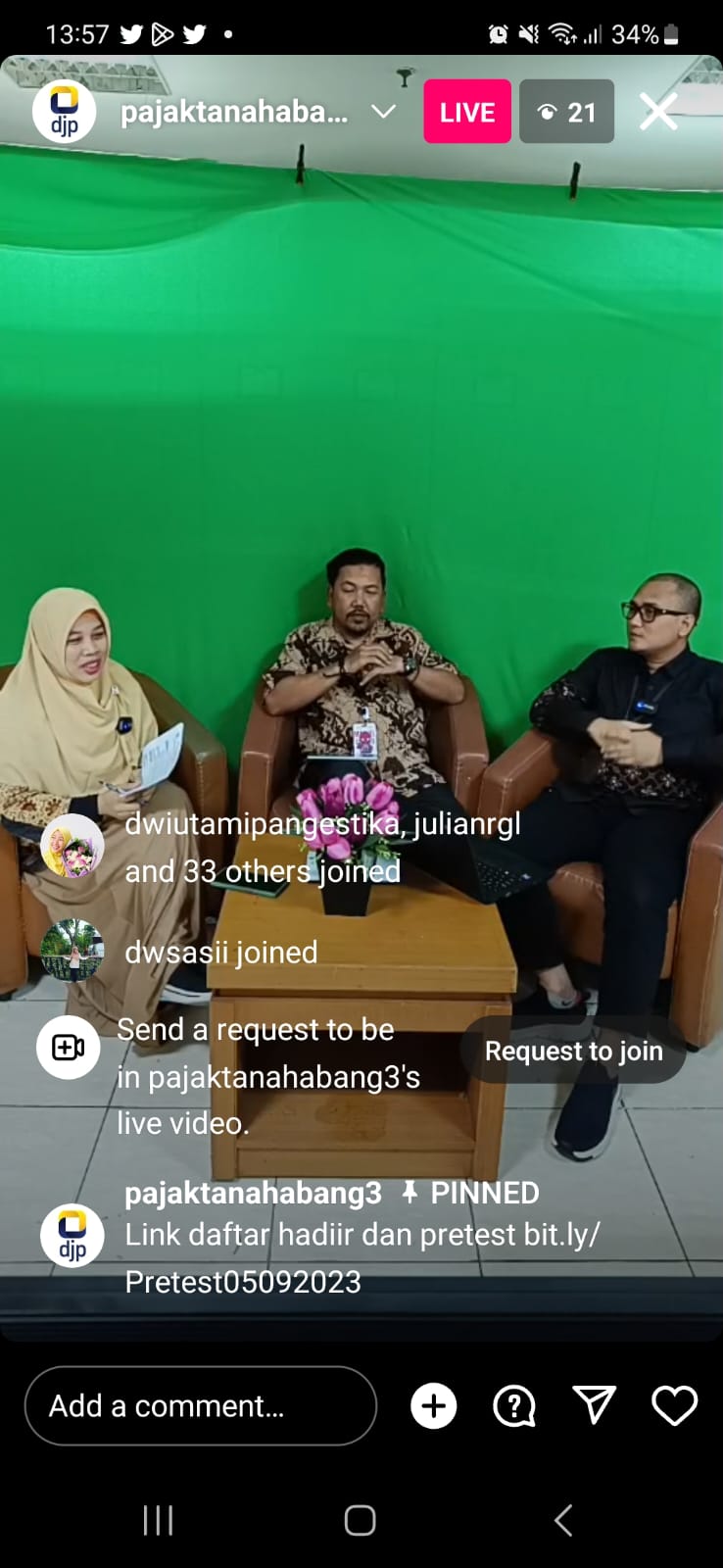 KPP Pratama Jakarta Tanah Abang Tiga (KPP TA3) memberikan edukasi perpajakan melalui media sosial Instagram yang disiarkan secara langsung di KPP TA3, Tanah Abang, Jakarta Pusat (Kamis, 7/9).