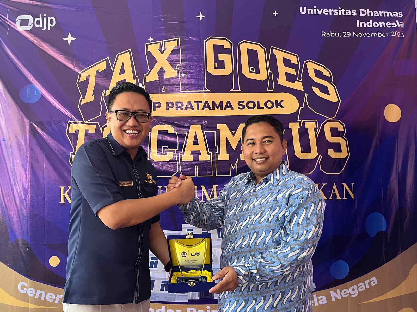 Kantor Pelayanan Pajak (KPP) Pratama Solok bersama Kantor Pelayanan, Penyuluhan, dan Konsultasi Perpajakan (KP2KP) Kotobaru mengunjungi Universitas Dharmas Indonesia (Undhari) dalam rangka Tax Goes to Campus (TGTC) 2023 sekaligus mengisi Kuliah Umum Perpajakan Fakultas Hukum dan Ekonomi Bisnis, Kabupaten Dharmasraya (Rabu, 29/11).