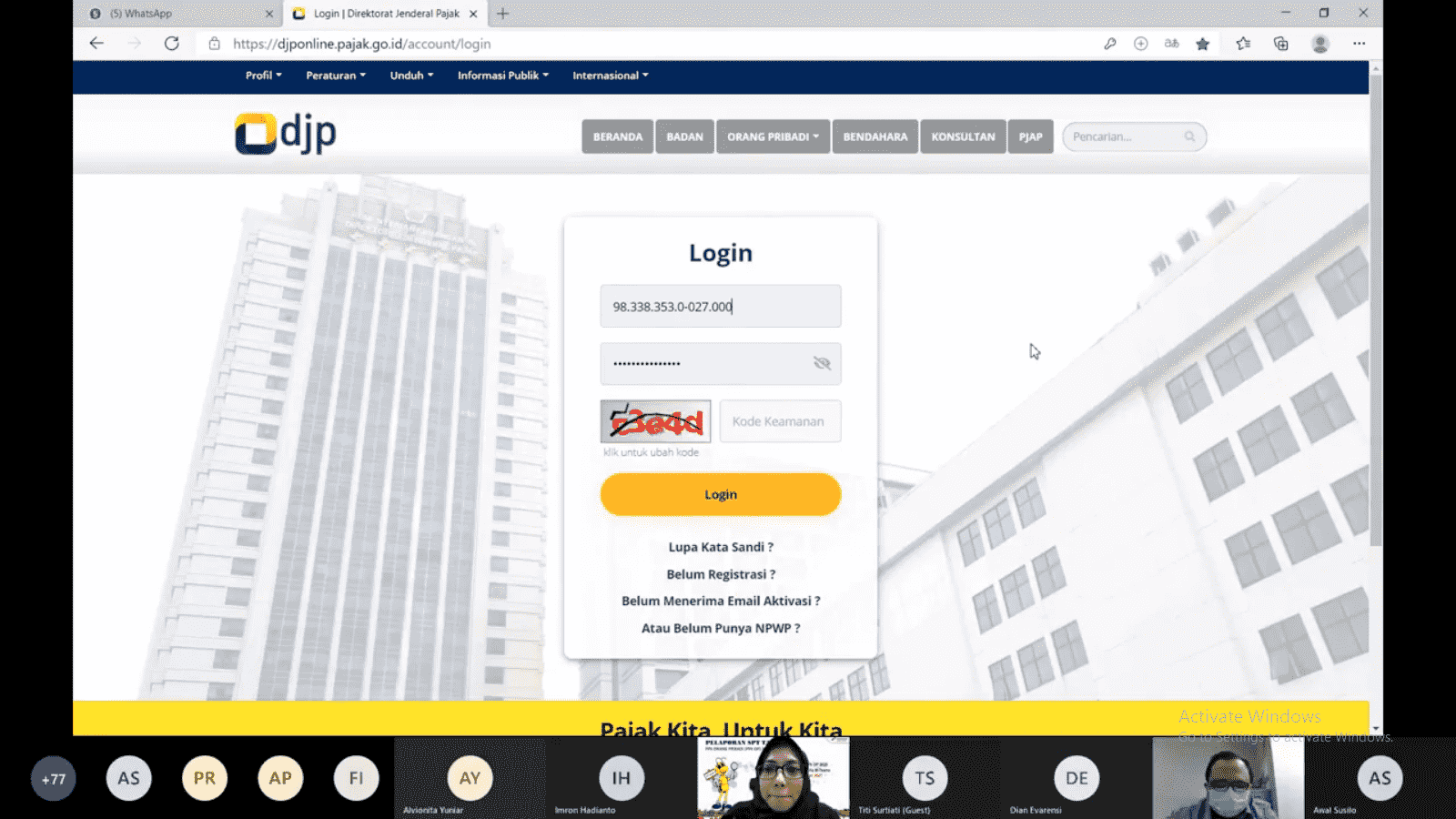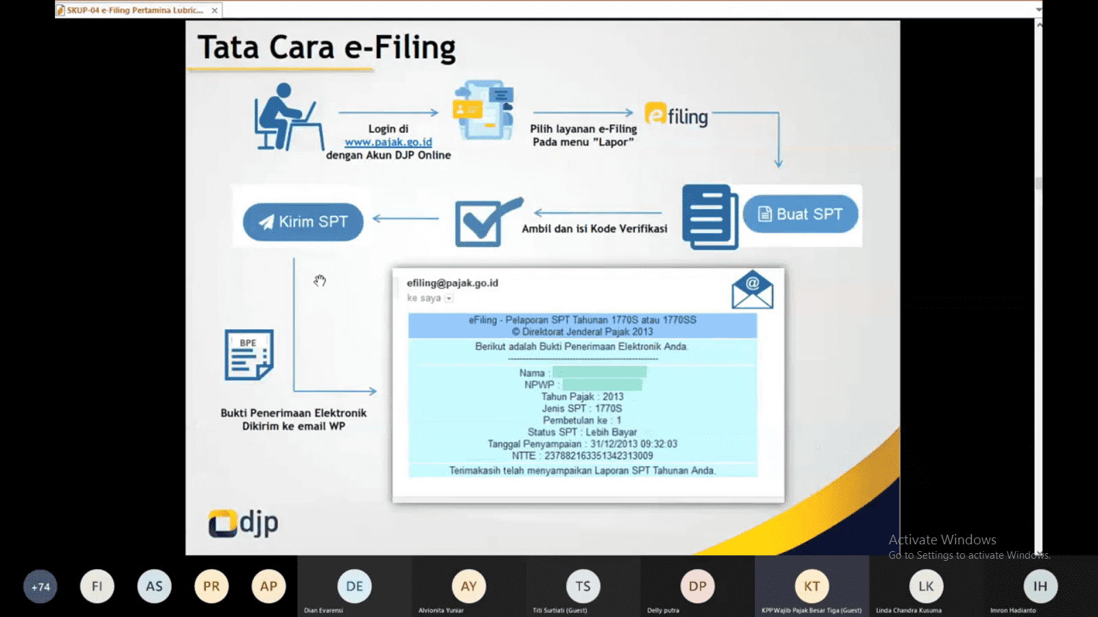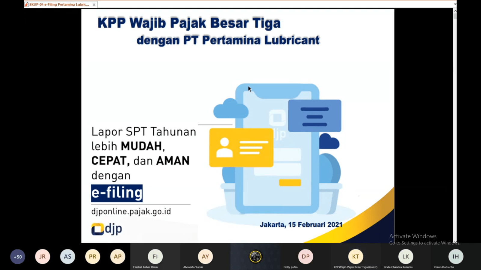 Acara dibuka oleh Bambang Setiawan selaku Plh. Kepala Seksi Pengawasan dan Konsultasi I (Waskon I) mewakili Kepala Kantor. dalam sambutannya Bambang mengucapkan terima kasih karena masih diberikan kesempatan untuk mendampingi pengisian SPT Tahunan di PT Pertamina Lubricants yang biasanya dilakukan secara langsung, dan sekarang secara daring, namun ini tidak mengurangi rasa keinginan kami untuk melayani kepentingan wajib pajak. Semoga seluruh karyawan di PT Pertamina Lubricants dapat memenuhi kewajiban perpajakan dengan baik.
