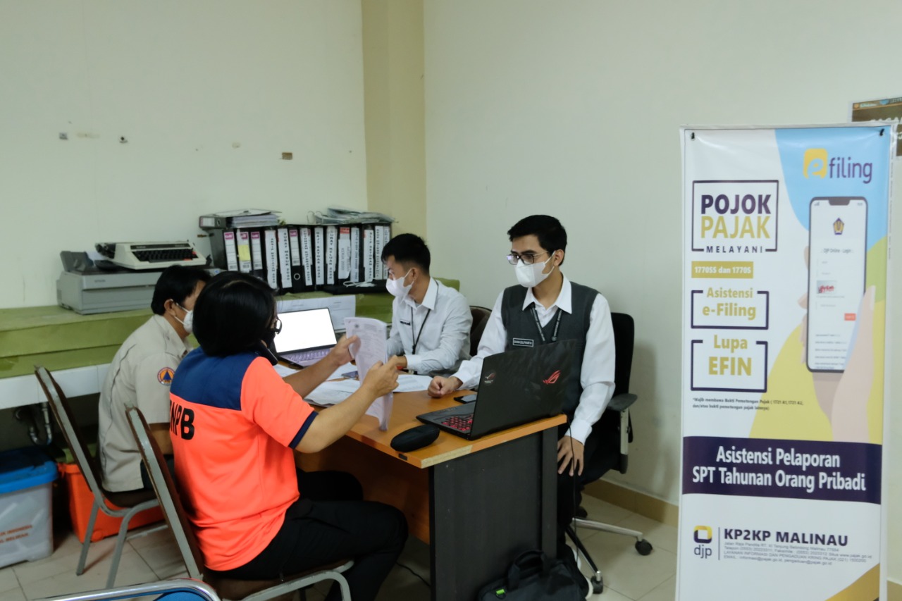 Kantor Pelayanan, Penyuluhan, dan Konsultasi Perpajakan (KP2KP) Malinau menggelar asistensi Pelaporan SPT Tahunan 1770S secara e-Filing kepada seluruh pegawai Badan Penanggulangan Bencana Daerah (BPBD) Pemerintah Kabupaten (Pemkab) Malinau di Kantor BPBD Pemkab Malinau, Malinau Kota (Senin, 18/1). Kepala KP2KP Malinau, Andika Setiawan didampingi tiga pegawai KP2KP Malinau disambut langsung oleh Kepala Pelaksana BPBD Malinau Ibau Jalung di ruang kerjanya.