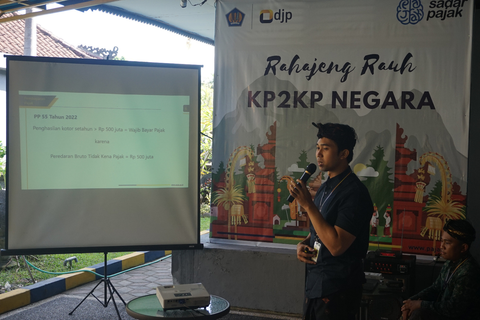 Gusti Putu Rizky Widyanata dan Muhammad Arif Luqman Syah selaku pelaksana KP2KP Negara menyampaikan materi Peraturan Pemerintah (PP) Nomor 23 Tahun 2018 yang diperbarui dengan PP Nomor 55 Tahun 2022 terkait fasilitas pembebasan pajak bagi Wajib Pajak Orang Pribadi (WPOP) usahawan/UMKM yang memiliki peredaran penghasilan bruto kurang dari 500 juta rupiah dalam setahun. Kemudian para wajib pajak dipandu untuk mengisi SPT Tahunan menggunakan formulir SPT 1770 yang dikhususkan untuk WP OP usahawan/pelaku UMKM.