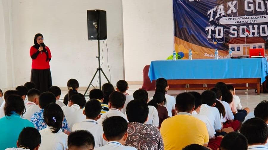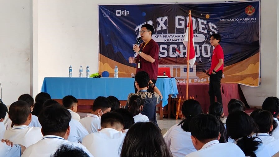 Kantor Pelayanan Pajak (KPP) Pratama Jakarta Kramat Jati mengadakan kegiatan Tax Goes to School (TGTS) di Aula Sekolah Menengah Pertama (SMP) Santo Markus I, Kramat Jati, Jakarta Timur (Jumat, 14/7).