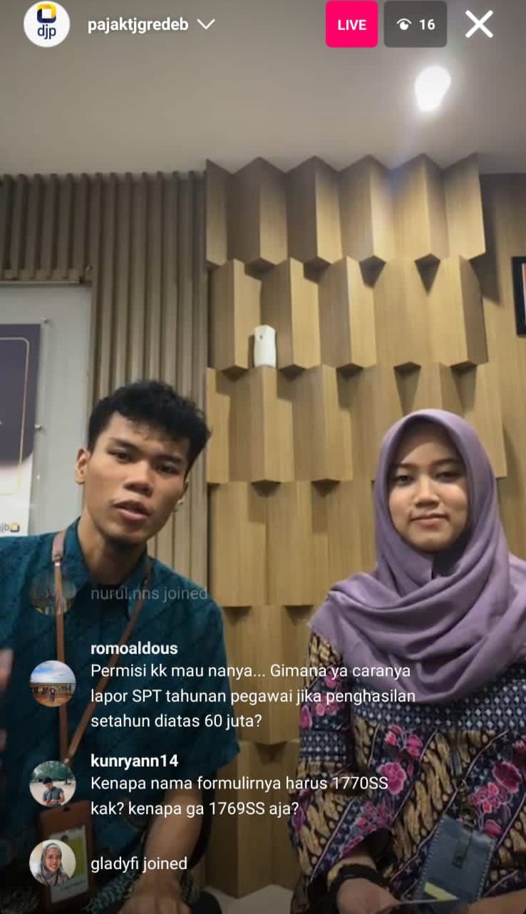 Ditonton oleh sebanyak 21 akun Instagram, siaran langsung Instagram ini membahas mengenai pemadanan Nomor Induk Kependudukan (NIK) sebagai Nomor Pokok Wajib Pajak (NPWP) dan pelaporan SPT Tahunan Orang Pribadi.
