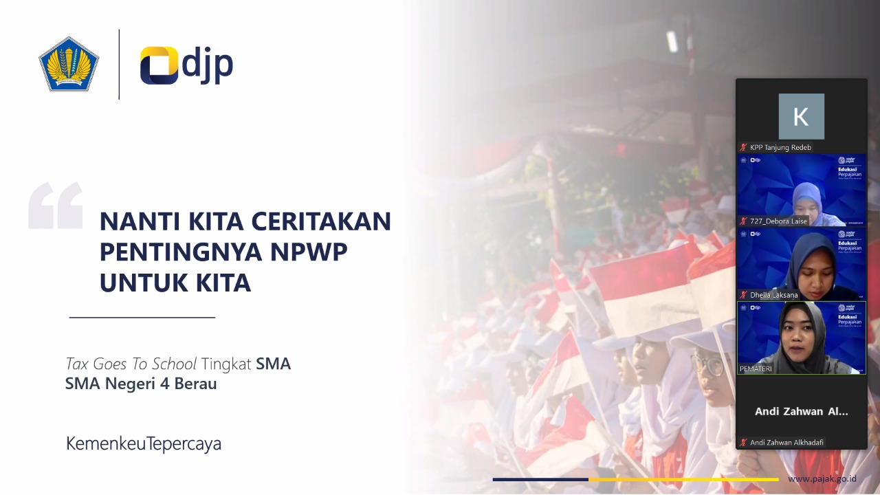 Kantor Pelayanan Pajak (KPP) Pratama Tanjung Redeb yang diwakili Kepala Seksi Pelayanan Debora Novriyati Laise Sihotang dan tim mengadakan kegiatan Tax Goes To School (TGTS) dengan tema “Nanti Kita Ceritakan Pentingnya NPWP Untuk Kita” bersama Sekolah Menengah Atas (SMA) Negeri 4 Berau secara daring di ruang rapat KPP Pratama Tanjung Redeb, Kota Tarakan (Rabu, 01/12).