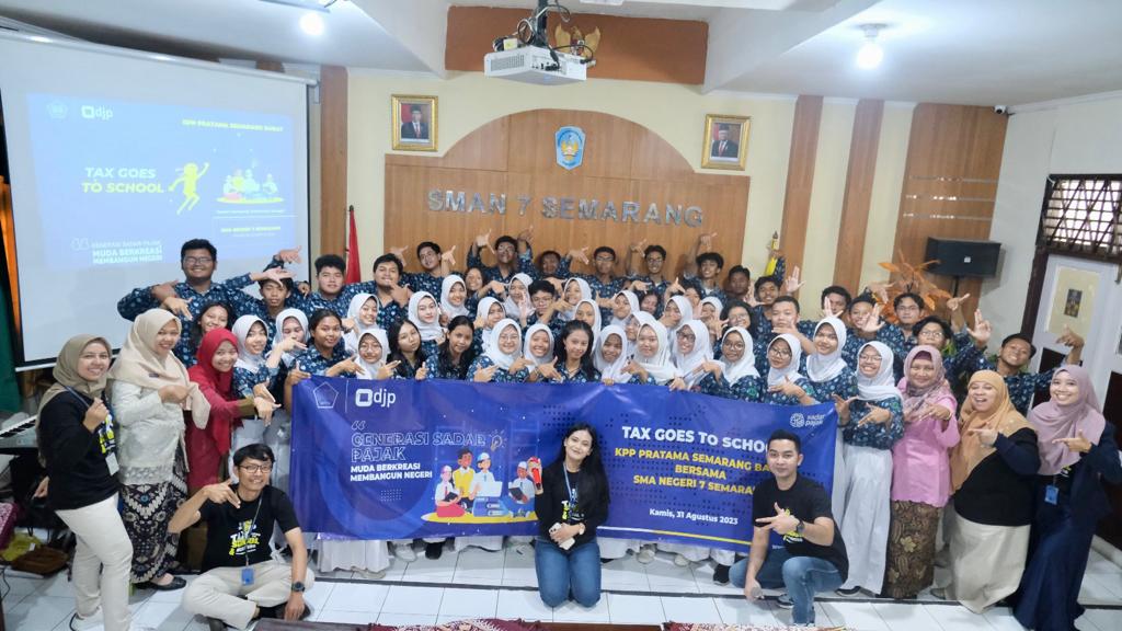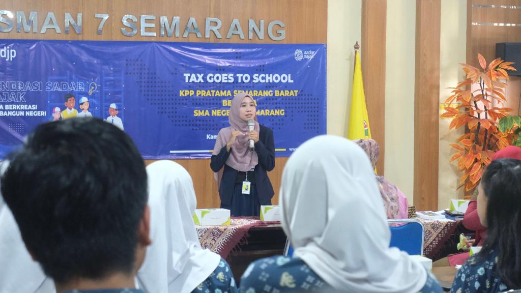 Kantor Pelayanan Pajak (KPP) Pratama Semarang Barat menggandeng Sekolah Menengah Atas (SMA) Negeri 7 Semarang dalam menyemarakkan kegiatan Tax Goes To School (TGTS) yang diikuti 50 pelajar SMA di Aula SMA 7 Semarang (Kamis, 31/8).