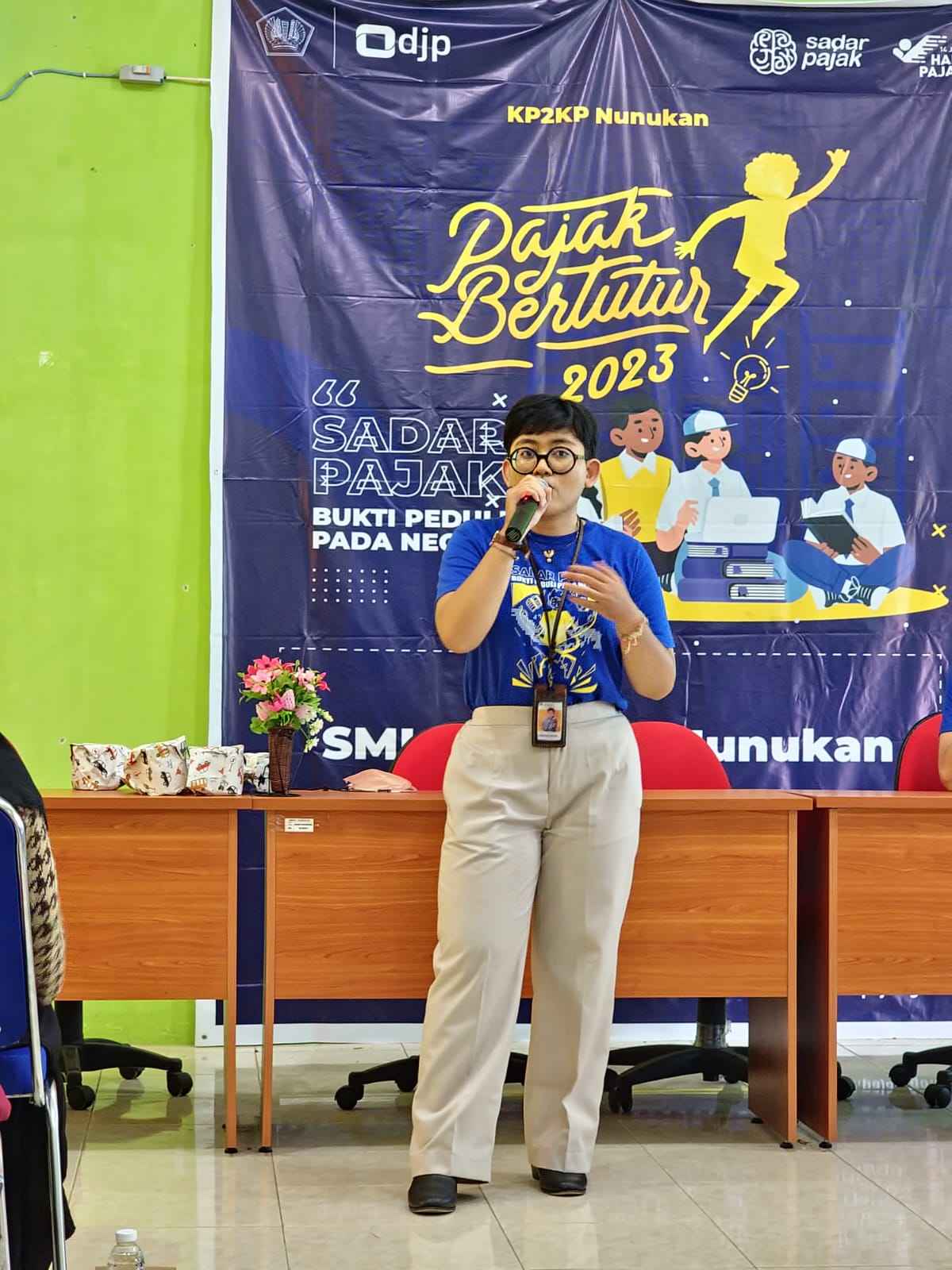 Kepala KP2KP Nunukan Ari Saptono turut menghadiri acara dan berkesempatan untuk membukakan kemeriahan acara Pajak Bertutur di Aula SMKN 1 Nunukan. Pajak Bertutur ini diisi dengan paparan materi dan beragam games-games yang diberikan kepada peserta, serta sesi tanya jawab sebagai sarana komunikasi dua arah dalam membantu pemahaman murid-murid kelas 11 Akuntansi SMKN 1 Nunukan akan pajak.