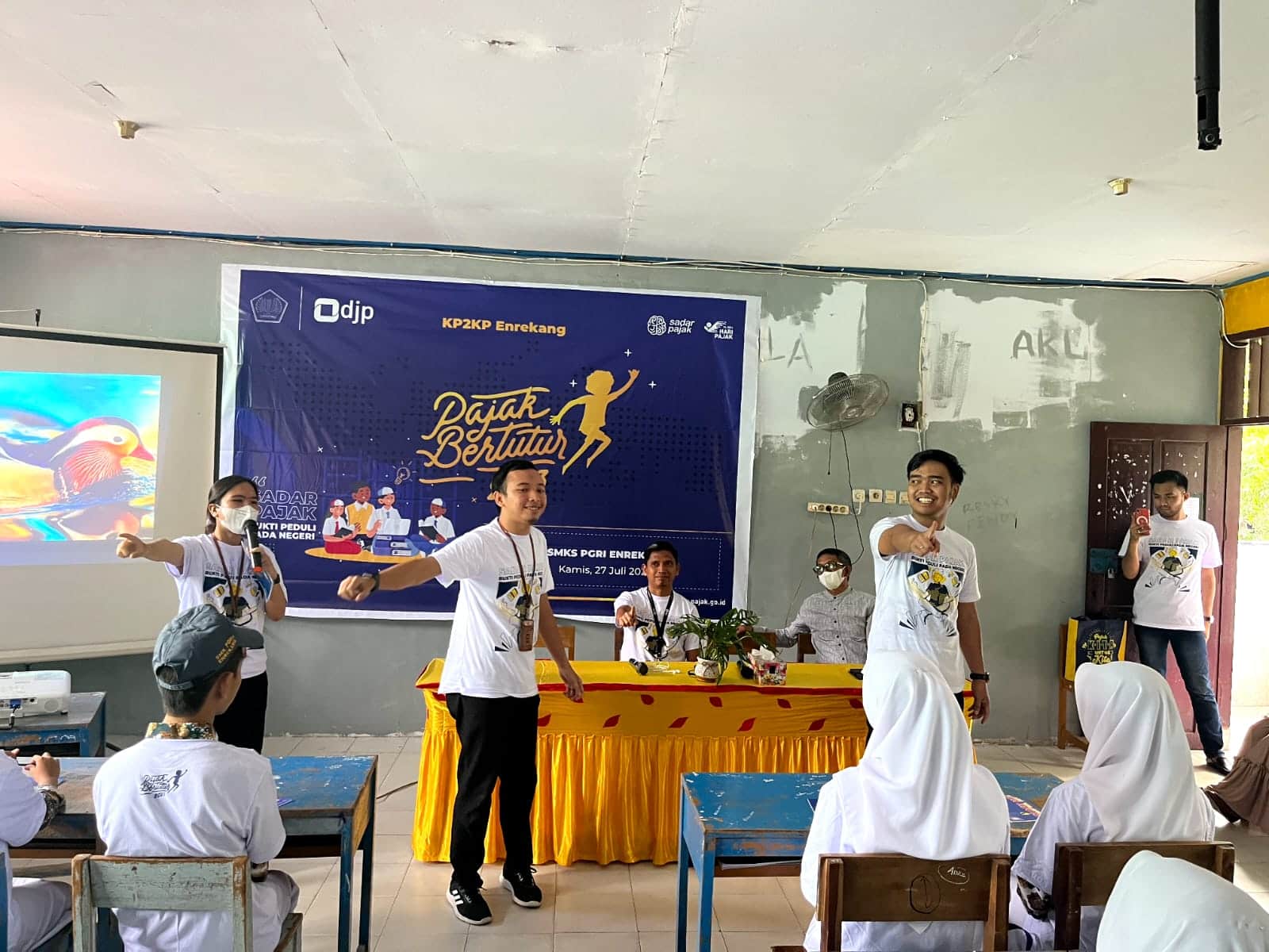Kantor Pelayanan, Penyuluhan, dan Konsultasi (KP2KP) Enrekang mengadakan Pajak Bertutur 2023 di Sekolah Menengah Kejuruan Swasta (SMKS) PGRI Enrekang di Jalan Haji Oemar Said Cokroaminoto, Kab. Enrekang (Kamis, 27/7). Kegiatan ini berlangsung dengan diisi dengan games menarik, lomba cerdas cermat, dan flashmob bersama yang dipandu langsung oleh Pegawai KP2KP Enrekang.