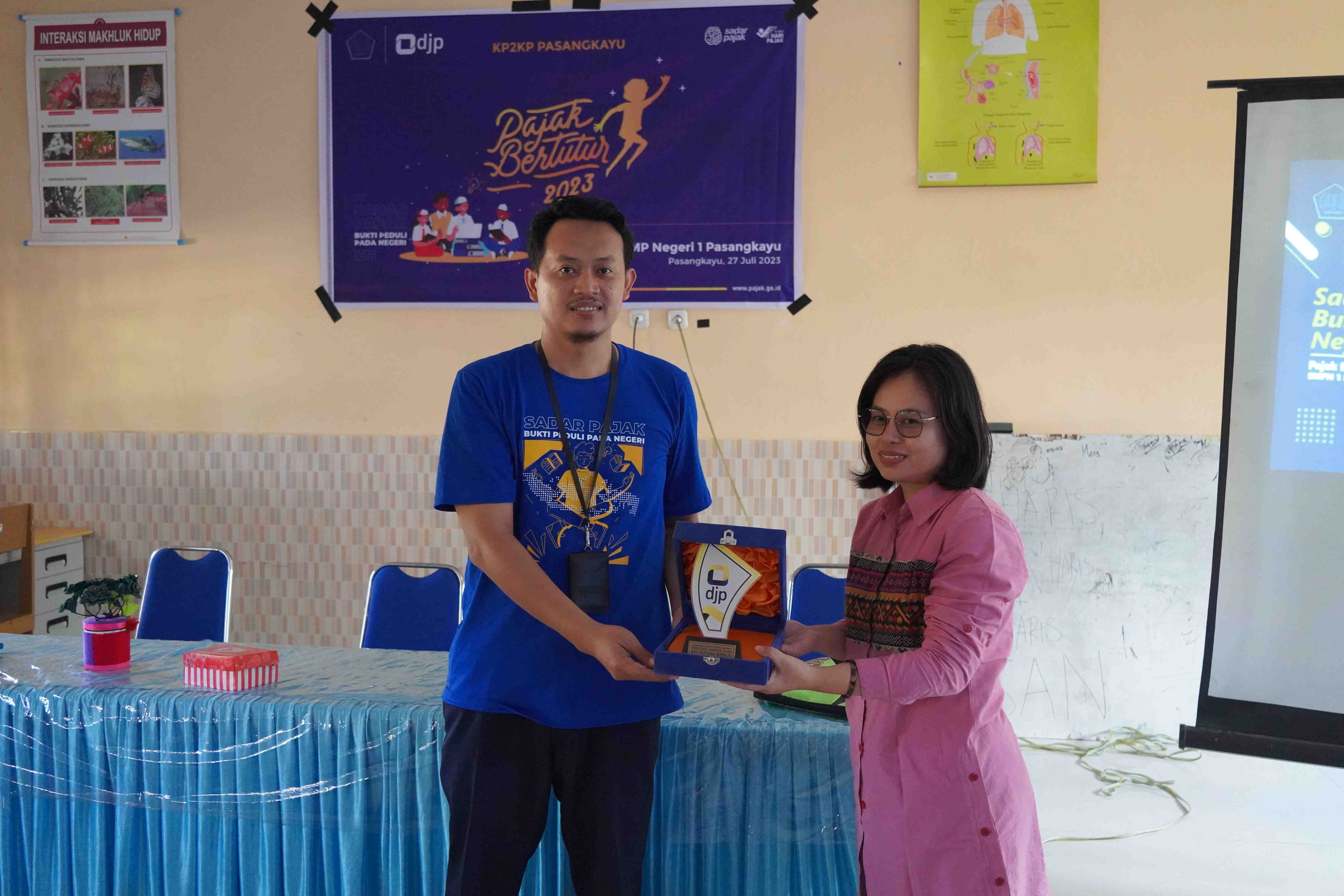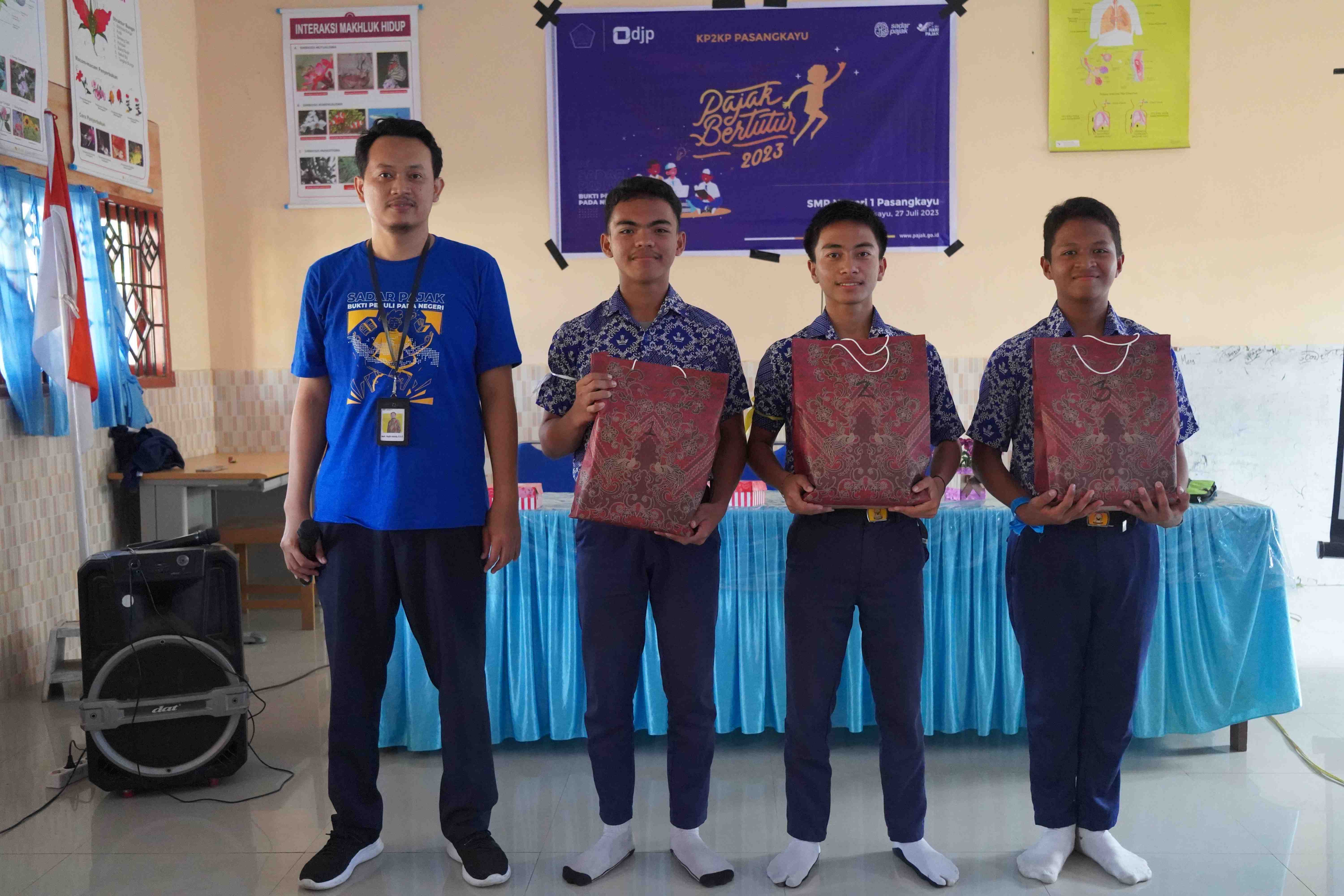 Kantor Pelayanan, Penyuluhan, dan Konsultasi Perpajakan (KP2KP) Pasangkayu mengadakan kegiatan Pajak Bertutur untuk siswa tingkat Sekolah Menengah Pertama (SMP). Kegiatan ini dilaksanakan di Ruang Laboratorium SMPN 1 Pasangkayu, Kab. Pasangkayu (Kamis, 27/7).