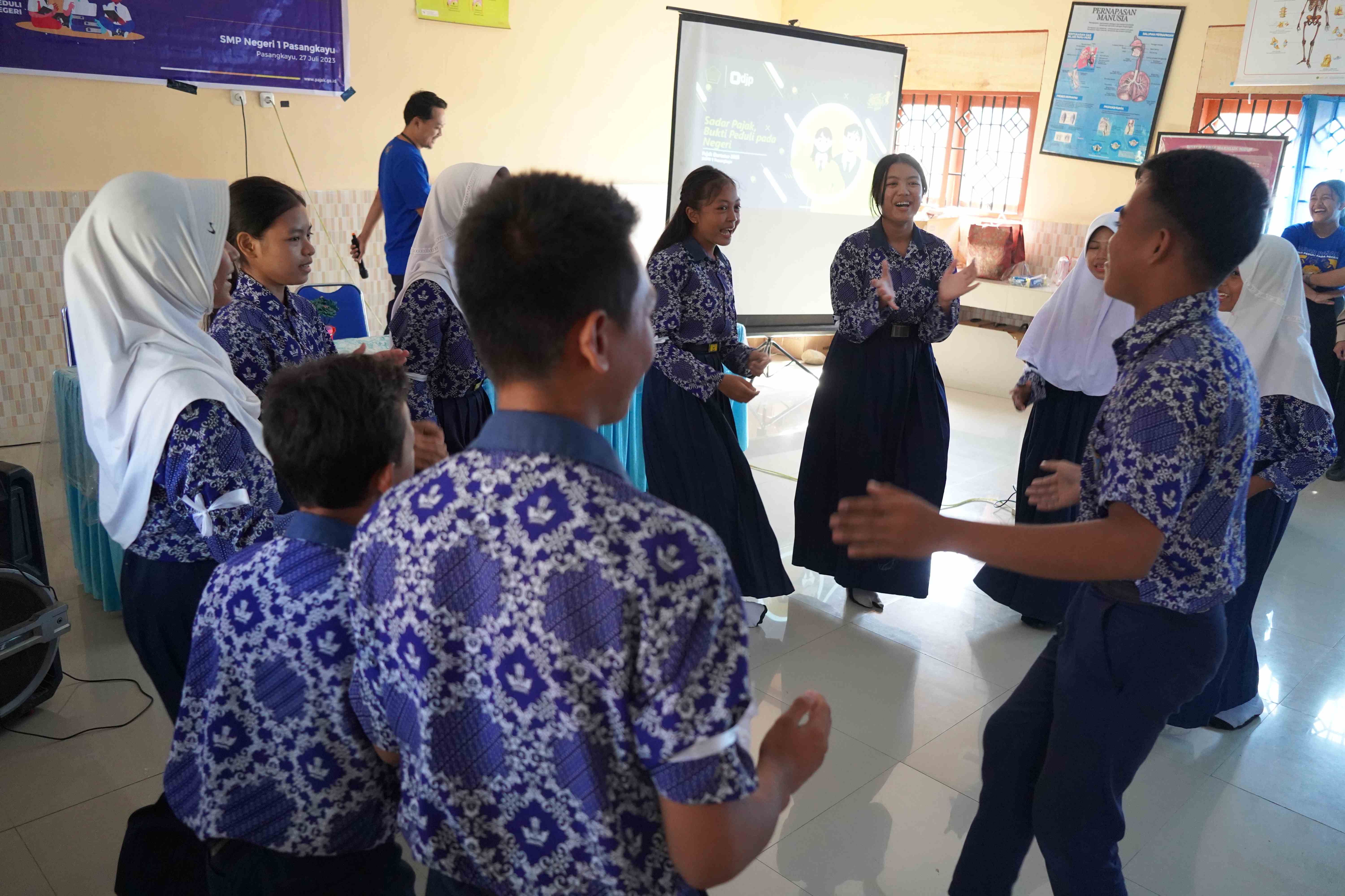 Puluhan peserta yang berasal dari siswa kelas VIII dan IX SMPN 1 Pasangkayu tidak hanya belajar pajak, para siswa juga menampilkan yel-yel bertema perpajakan dari masing-masing kelompok untuk menambah semangat .