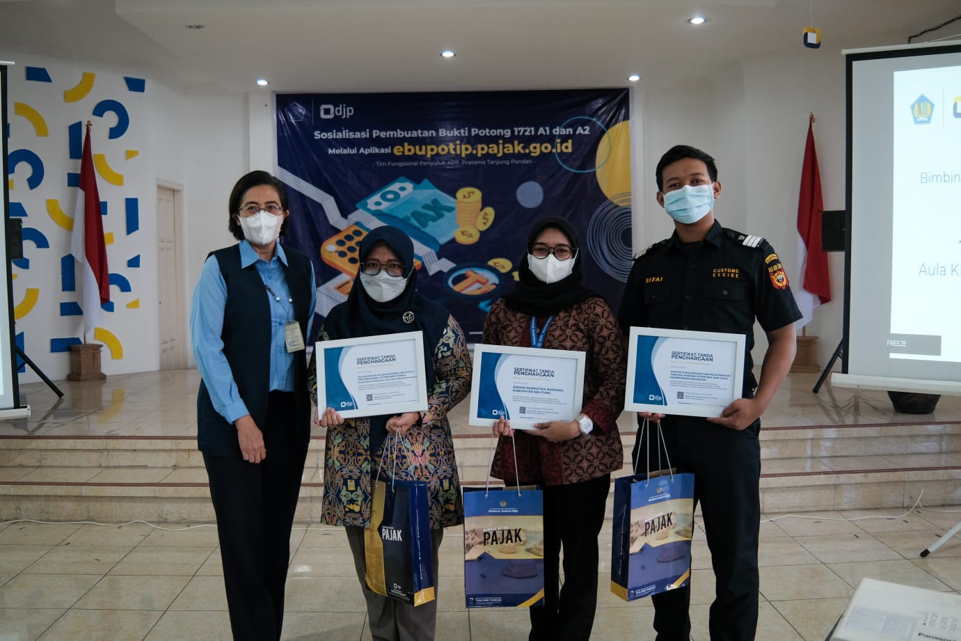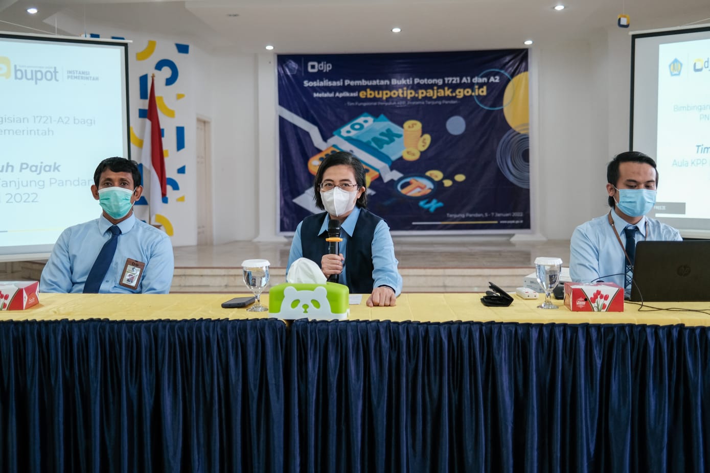 Monita Junita Nasution selaku Kepala KPP Pratama Tanjung Pandan membuka kegiatan sosialisasi sekaligus memberikan penghargaan kepada Instansi Pemerintah dengan tingkat kepatuhan pelaporan Surat Pemberitahuan (SPT) masa terbaik periode tahun pajak 2021. "Dengan adanya aplikasi ebupotip unifikasi ini diharapkan dapat memudahkan Instansi Pemerintah dalam membuat bukti potong, membuat billing, sekaligus melaporkan SPT Masa dalam satu aplikasi," ujar Mona Junita Nasution.