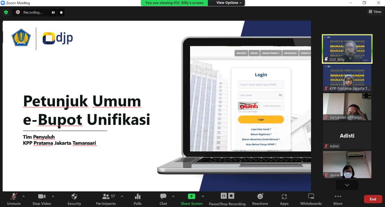 Kantor Pelayanan Pajak (KPP) Pratama Jakarta Tamansari kembali mengadakan kegiatan Sosialisasi e-Bupot Unifikasi yang dilangsungkan secara daring melalui aplikasi zoom meeting di Jakarta (Kamis, 19/5).