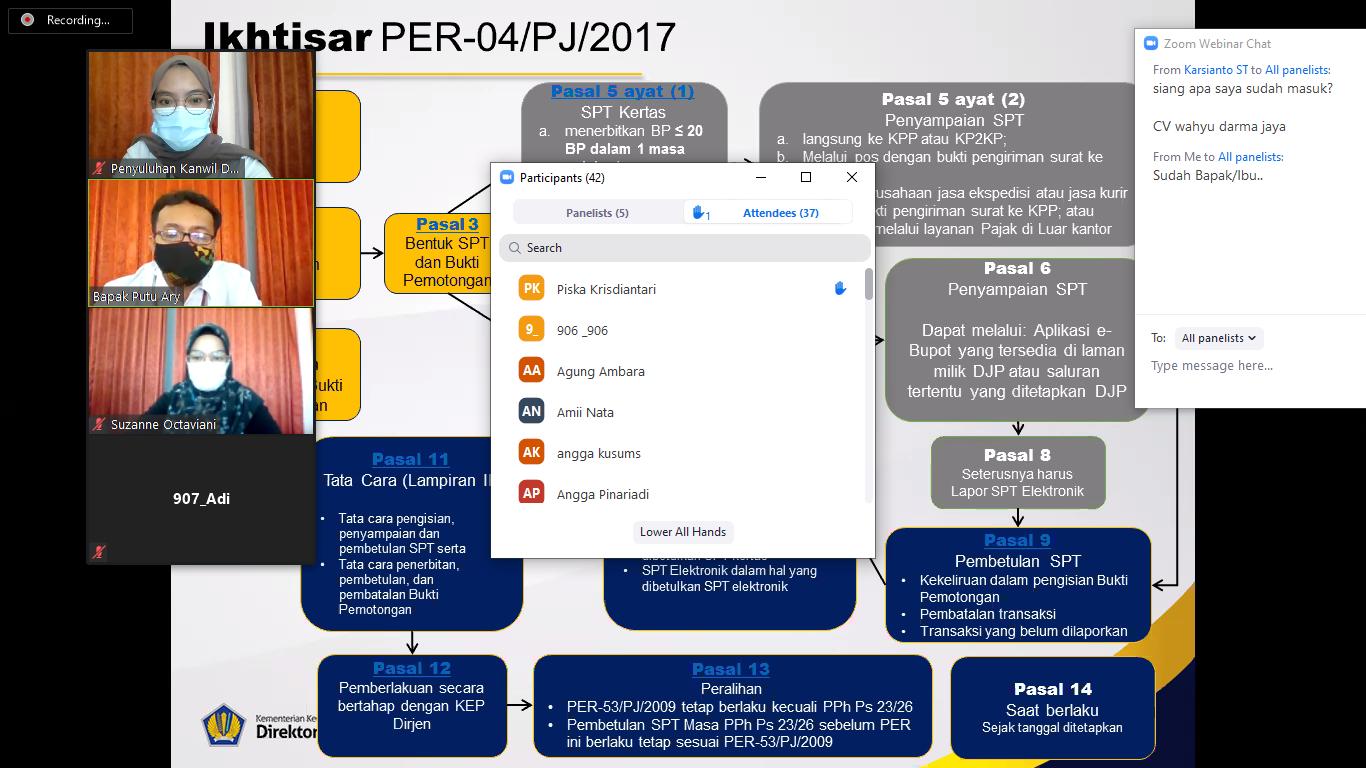 KPP Pratama Badung Utara (Batara) sosialisasikan pengenalan aplikasi e-Bupot PPh Pasal 23 dan/ 26 bagi Pengusaha Kena Pajak (PKP) di wilayahnya melalui Zoom webinar di aula lantai 3 KPP Paratama Badung Utara (Senin, 20/7). Sosialisasi ini diikuti 42 orang dengan pemateri dari Account Representative (AR) Seksi Pengawasan dan Konsultasi I dan Seksi Ekstensifikasi dan Penyuluhan.