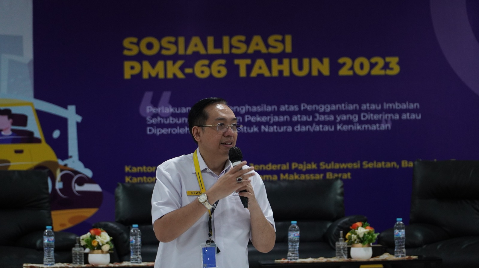 Kantor Wilayah Direktorat Jenderal Pajak Sulawesi Selatan, Barat, dan Tenggara (Kanwil DJP Sulselbartra) mengadakan Sosialisasi Peraturan Menteri Keuangan (PMK) 66 Tahun 2023 di Aula Gedung Keuangan Negara (GKN) II Makassar, Sulawesi Selatan (Kamis, 3/8). Berkolaborasi dengan Kantor Pelayanan Pajak (KPP) Pratama Makassar Barat, acara ini dihadiri oleh wajib pajak di wilayah kerja KPP Pratama Makassar Barat.
