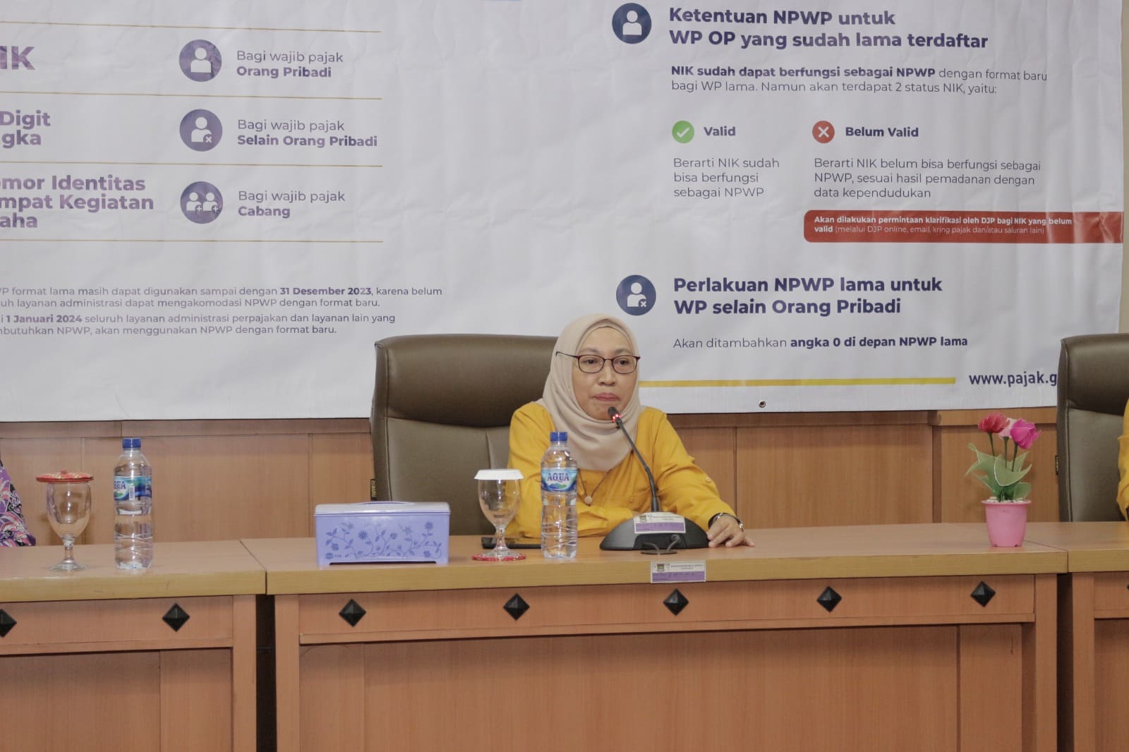 Acara dilanjutkan dengan sambutan dari Kepala KPP Pratama Tigaraksa Widie Widayani, kemudian dilanjutkan dengan kegiatan sosialisasi pemadanan NIK menjadi NPWP yang dibawakan oleh Asisten Penyuluh yang berasal dari KPP Pratama Tigaraksa.