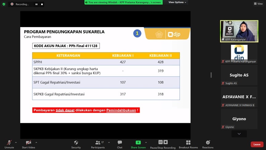 Kantor Pelayanan Pajak (KPP) Pratama Karanganyar mengadakan kelas pajak Program Pengungkapan Sukarela (PPS) secara daring di Karanganyar (Rabu,16/02).