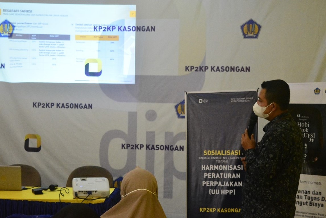 Kantor Pelayanan, Penyuluhan, dan Konsultasi Perpajakan (KP2KP) Kasongan menggelar Sosialisasi Undang-Undang Harmonisasi Peraturan Perpajakan dengan mengundang para pegiat UMKM di Wilayah Kabupaten Katingan secara tatap muka dengan protokol kesehatan bertempat back office KP2KP Kasongan (Selasa, 16/11).