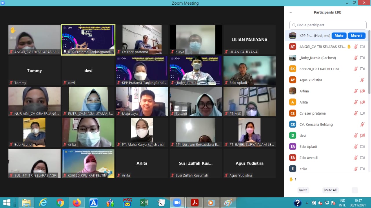 Kantor Pelayanan Pajak (KPP) Pratama Tanjung Pandan menggelar sosialisasi Undang-Undang Harmonisasi Peraturan Perpajakan (UU HPP) Nomor 7 Tahun 2021 secara daring melalui media aplikasi Zoom Meeting di Tanjung Pandan (Selasa, 30/11). Kegiatan edukasi perpajakan ini diikuti oleh kurang lebih 30 wajib pajak.