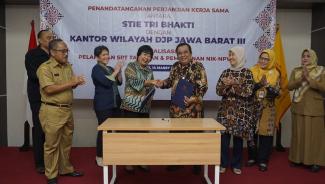 Kepala Kantor Wilayah Direktorat Jenderal Pajak (Kanwil DJP) Jawa Barat III Lucia Widiharsanti dan Ketua STIE Tri Bhakti Bekasi Widayatmoko teken Perjanjian Kerja Sama tentang tax center di Auditorium STIE Tri Bhakti Bekasi (Selasa, 14/3).