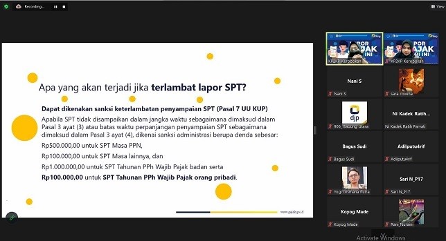 Kantor Pelayanan, Penyuluhan, dan Konsultasi (KP2KP) Kerobokan mengundang Wajib Pajak Orang Pribadi Karyawan untuk mengikuti kegiatan sosialisai online dalam bentuk kelas pajak guna untuk memperkenalkan kembali tata cara pembayaran Surat Tagihan Pajak (STP) melalui aplikasi Zoom Meeting (Rabu, 13/09).