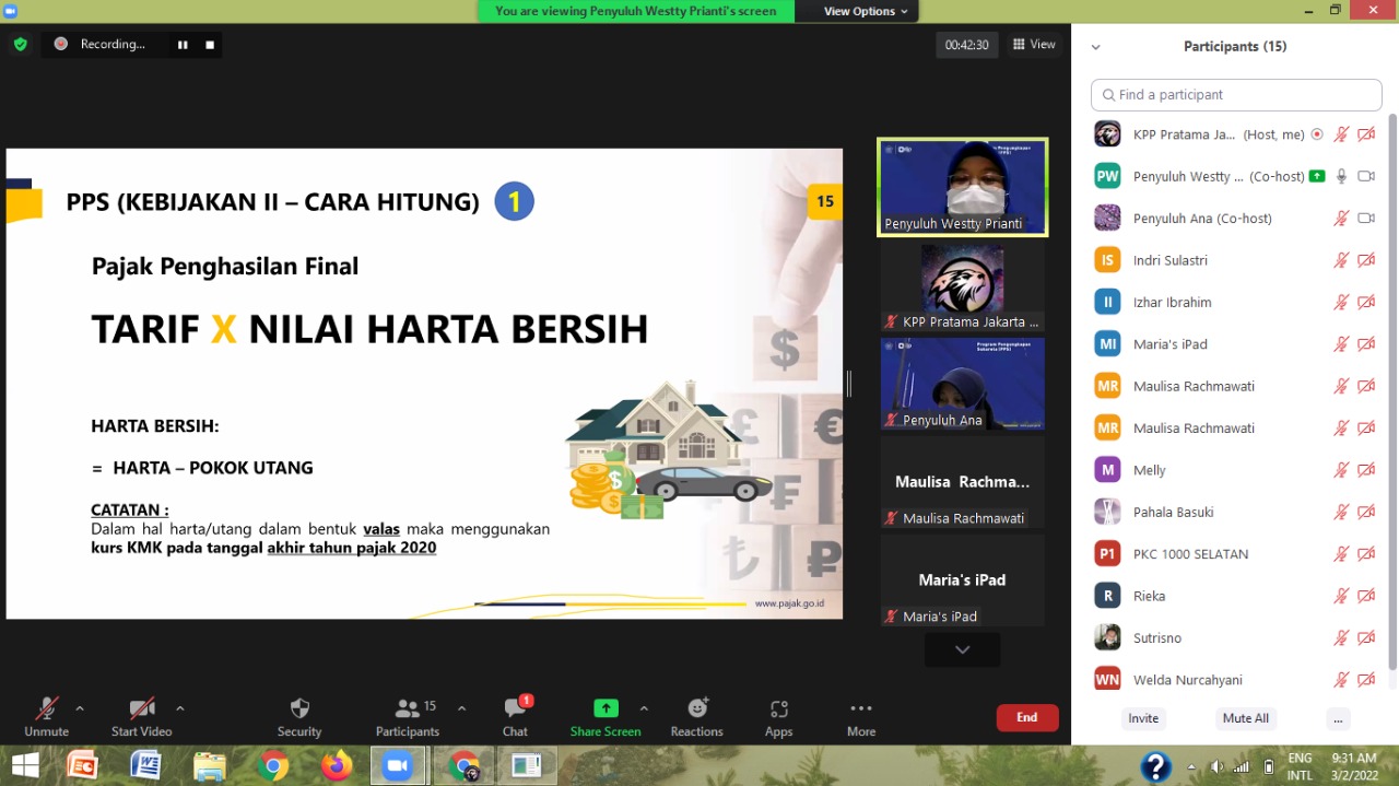 Kantor Pelayanan Pajak (KPP) Pratama Jakarta Pademangan mengadakan Kelas Pajak Program Pengungkapan Sukarela (PPS) (Rabu, 2/3). Kegiatan diselenggarakan melalui aplikasi Zoom Meeting di ruang penyuluh KPP Pratama Jakarta Pademangan dan dihadiri 10 wajib pajak.