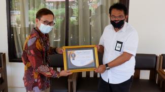 Kepala KPP Pratama Kolaka Jarod Sri Raharjo menyerahkan penghargaan secara langsung kepada Hamdan, Vice President Finance PT Aneka Tambang.