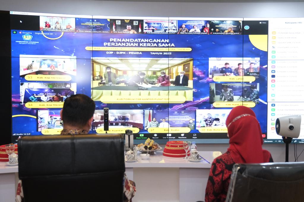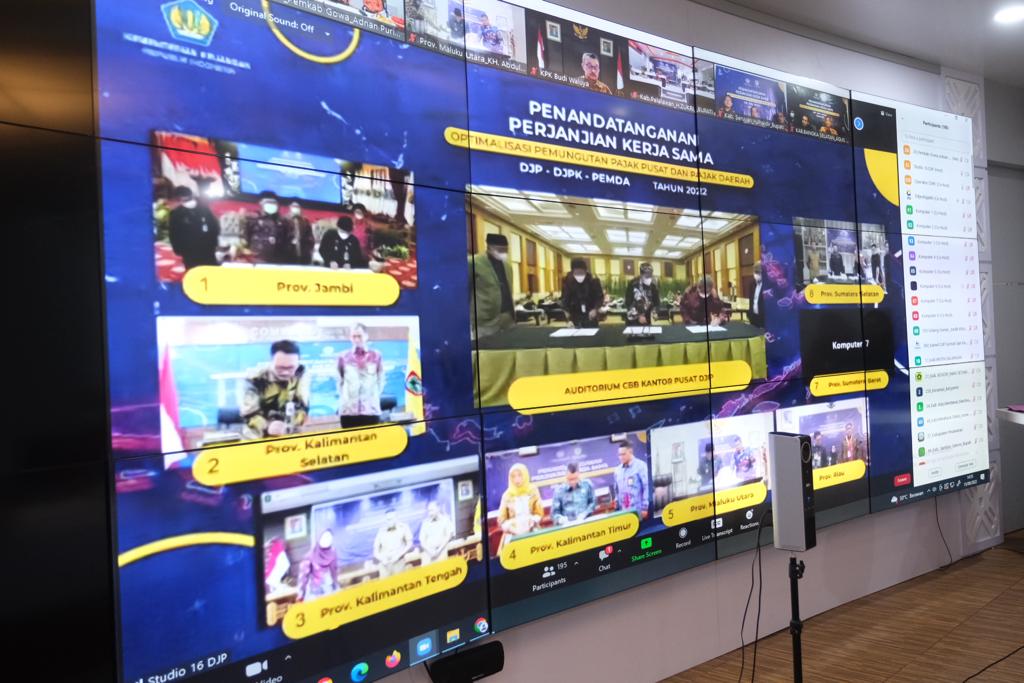 Acara penandatanganan dokumen PKS tahap IV tahun 2022 ini dilangsungkan secara hybrid melalui Zoom Cloud Meeting dari Aula Cakti Buddhi Bakti (CBB), Gedung Marie Muhammad, Kantor Pusat Direktorat Jenderal Pajak (DJP). Acara yang dihadiri oleh total 86 pemerintah daerah (Pemda) dari seluruh Indonesia ini berlangsung dengan baik dan lancar.