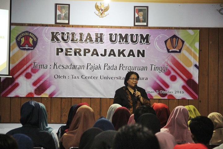 Tax Center Universitas Madura (UNIRA) bekerja sama dengan Kantor Wilayah DJP Jawa Timur II menggelar kuliah umum dengan tema 'Kesadaran Pajak pada Perguruan Tinggi' di Aula Rektorat UNIRA, Pamekasan (Kamis, 3/10). Acara kuliah umum tersebut menghadirkan Nyoman Ayu Ningsih selaku Kepala Bidang P2Humas Kanwil DJP Jawa TImur II sebagai pembicara.