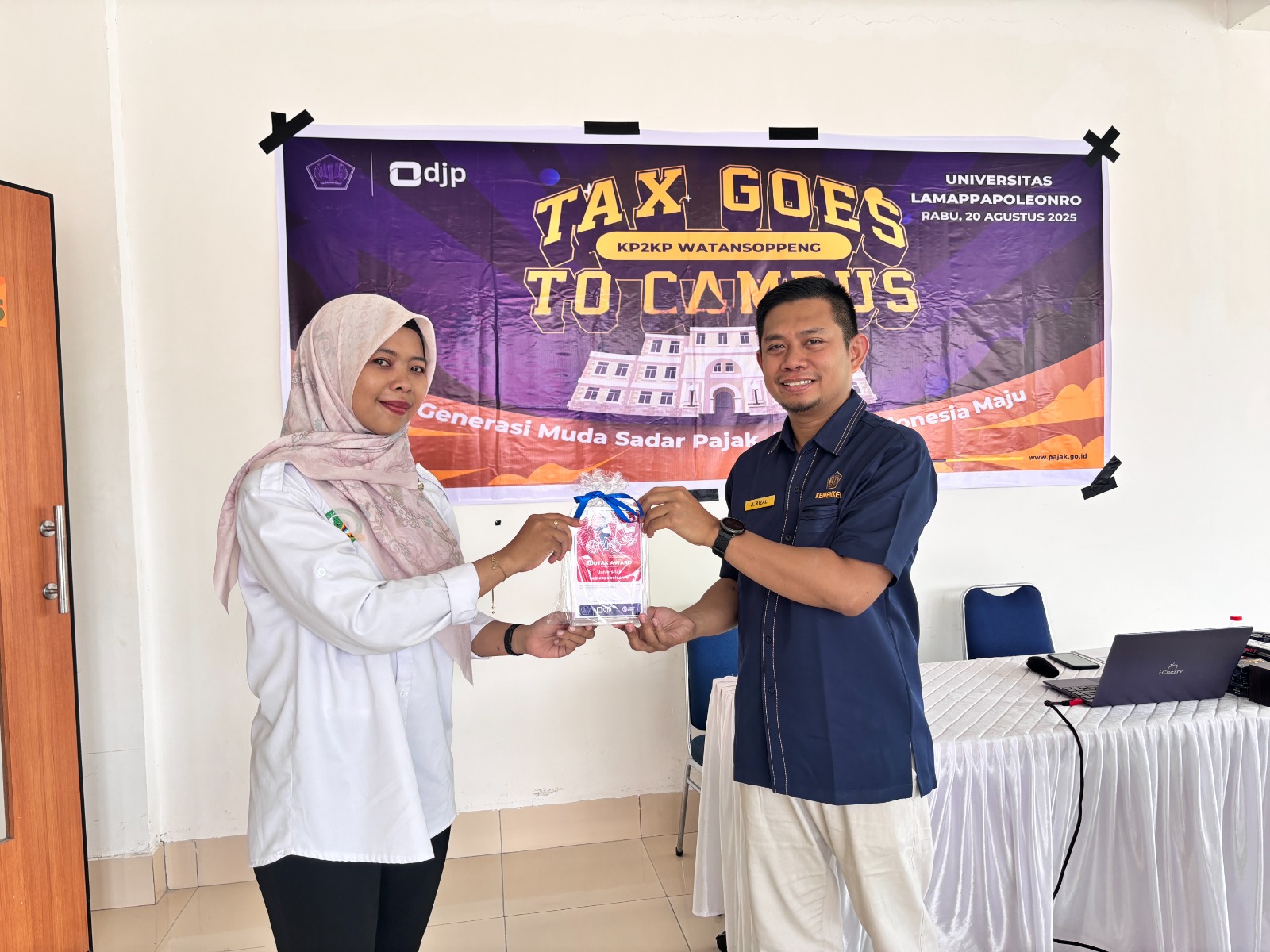 Kantor Pelayanan Penyuluhan dan Konsultasi Perpajakan (KP2KP) Watansoppeng menggelar acara tax goes to campus di Universitas Lamappapoleonro, Kabupaten Soppeng (Rabu, 20/8). Kegiatan yang mengusung tema “Generasi Muda Sadar Pajak untuk Indonesia Maju” ini diikuti oleh 25 mahasiswa program studi Akuntansi.