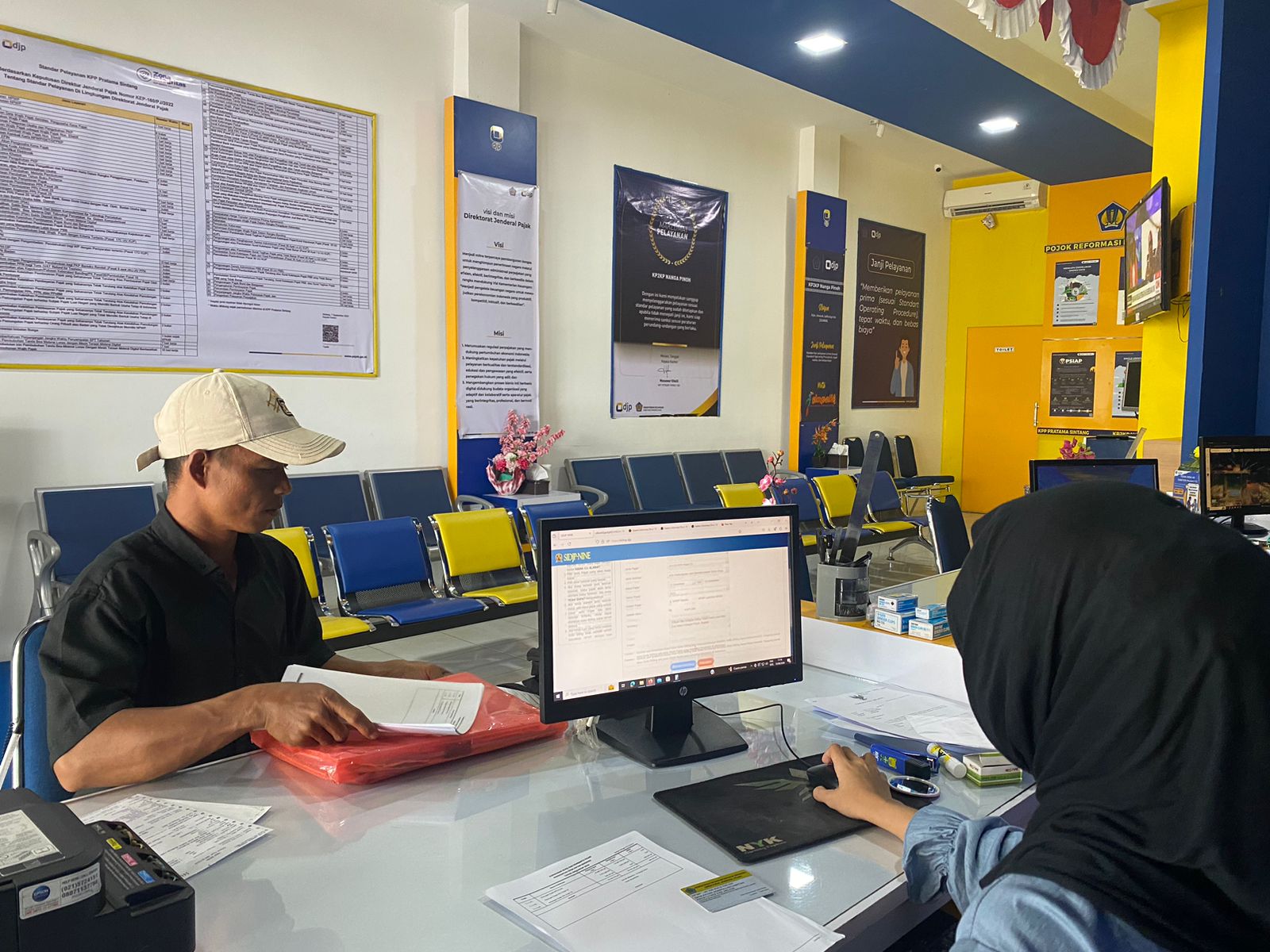 Salah satu wajib pajak yang merupakan bendahara Desa Kayan Semampau Kecamatan Pinoh Utara Kabupaten Melawi melakukan konsultasi terkait pembuatan kode billing bersama dengan Petugas Penyuluh Kantor Pelayanan, Penyuluhan, dan Konsultasi Perpajakan (KP2KP) Nanga Pinoh di ruang Tempat Pelayanan Terpadu (TPT) KP2KP Nanga Pinoh, Kabupaten Melawi (Kamis, 15/8). Diketahui wajib pajak tersebut menempuh perjalanan kurang lebih dua jam ke kantor pajak.