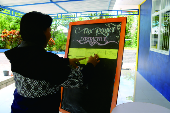 Kertas yang sudah berisi penilaian dapat wajib pajak tempelkan di papan Tax Payer Experience yang terletak di dekat pintu masuk. Wajib pajak yang memberi penilaian di papan Tax Payer Experience, akan mendapatkan suvenir, sehingga wajib pajak dengan antusias memberikan penilaian terhadap pelayanan KP2KP Talaud.