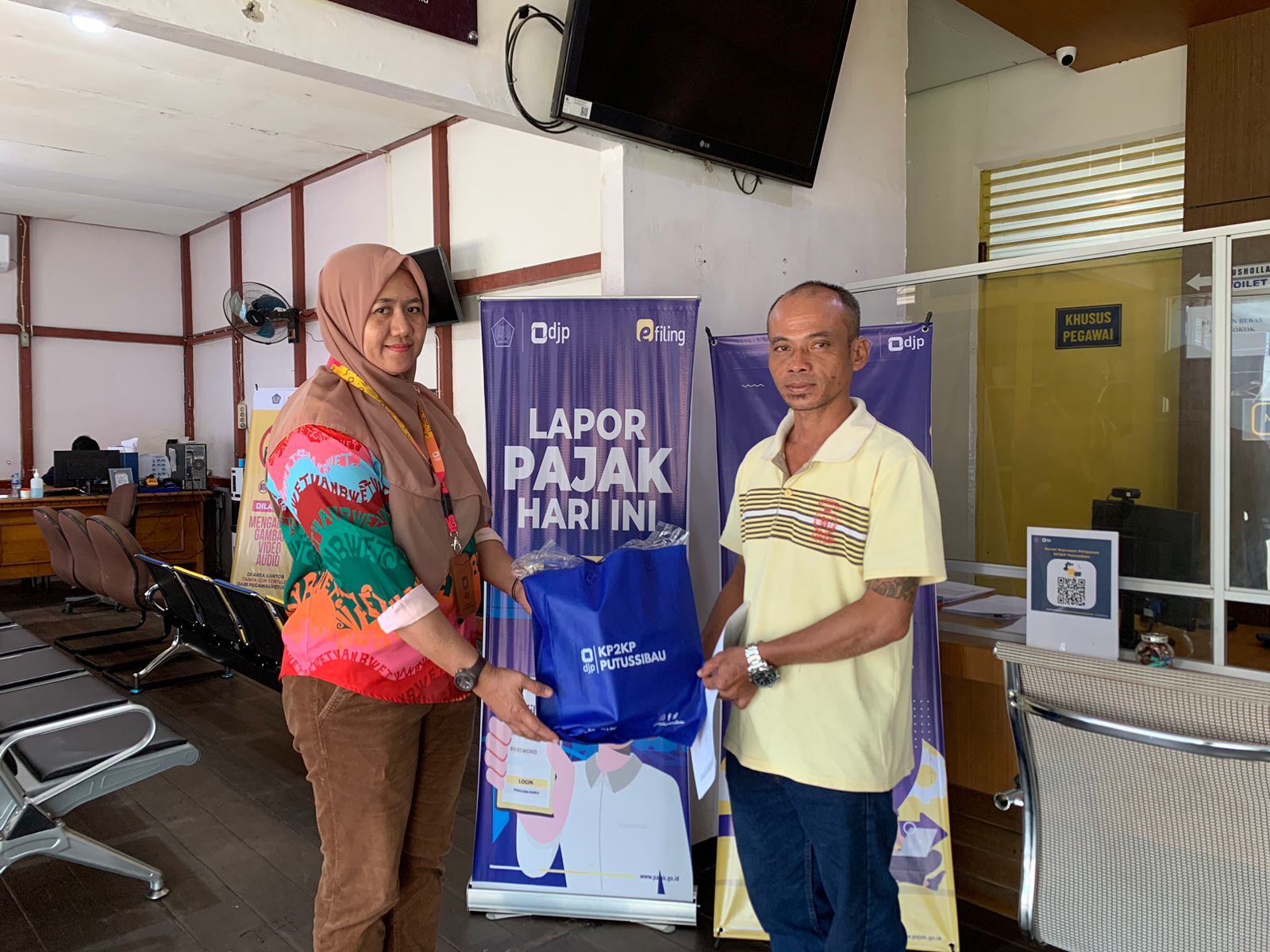 Kantor Pelayanan, Penyuluhan, dan Konsultasi Perpajakan (KP2KP) Putussibau memberikan apresiasi kepada Fasius, Petani Sawit dari Desa Padua Mendalam, atas penyampaian Surat Pemberitahuan Tahunan (SPT) paling awal di Loket Tempat Pelayanan Terpadu (TPT) Putussibau (Jumat, 5/1).