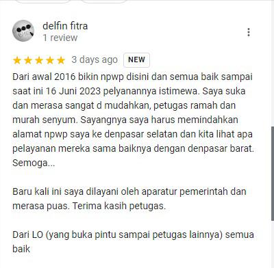 “Baru kali ini saya dilayani oleh aparatur pemerintah dan merasa puas. Terima kasih petugas pajak,” ungkap Delfin Fitra salah seorang wajib pajak Kantor Pelayanan Pajak Pratama Denpasar Barat dalam laman google review (Jumat,16/6). Google review adalah sebuah fitur yang telah terintegrasi dalam Google My Business (GMB) dan Google Maps.