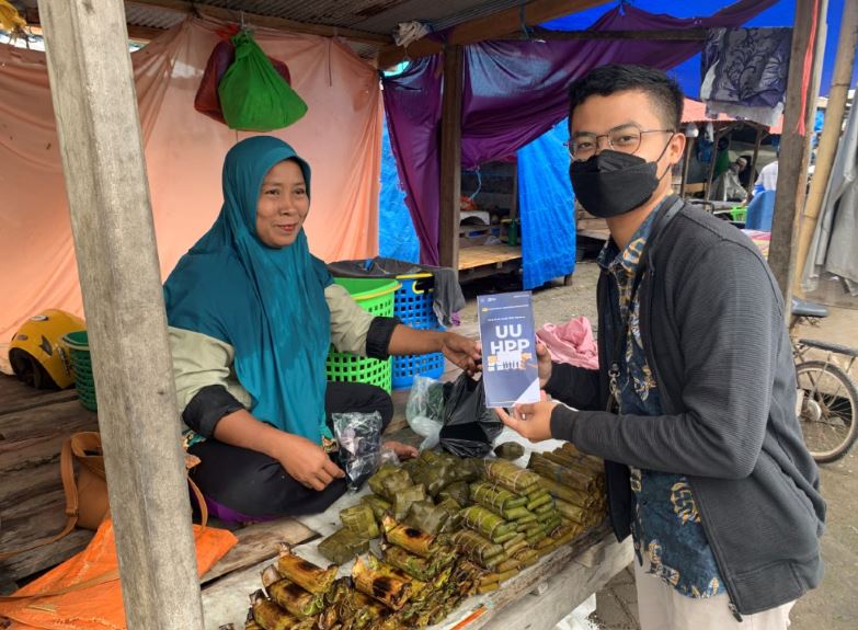 Kantor Pelayanan, Penyuluhan, dan Konsultasi Perpajakan (KP2KP) Benteng melakukan sosialisasi secara langsung terkait Undang-Undang Harmonisasi Peraturan Perpajakn (UU HPP) kepada Wajib Pajak Orang Pribadi pelaku UMKM yang berada di Pasar Bonea, Kecamatan Benteng, Kabupaten Kepulauan Selayar (Selasa, 22/2).