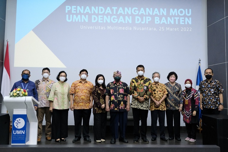 Kepala Kantor Wilayah Direktorat Jenderal Pajak (DJP) Banten Dionysius Lucas Hendrawan dan Rektor Universitas Multimedia Nusantara (UMN) Ninok Leksono menandatangani perpanjangan Nota Kesepakatan tentang Tax Center dan Perjanjian Kerja Sama (PKS) tentang Peningkatan Kesadaran Pajak pada Pendidikan Tinggi antara DJP dengan UMN di Lecture Hall UMN, Kabupaten Tangerang (Jumat, 25/3).