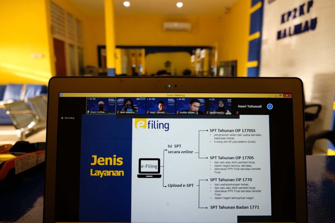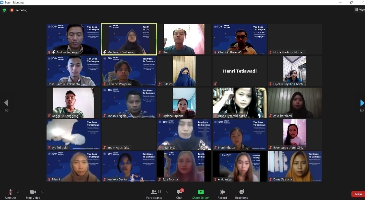 Mahasiswa Politeknik Malinau mengikuti kegiatan Tax Goes To School (TGTC) yang diselenggarakan oleh Kantor Pelayanan, Penyuluhan, dan Konsultasi Perpajakan (KP2KP) Malinau pada pukul 16:00 waktu setempat secara daring melalui aplikasi Zoom Cloud Meetings di Kabupaten Malinau (Kamis, 29/4).