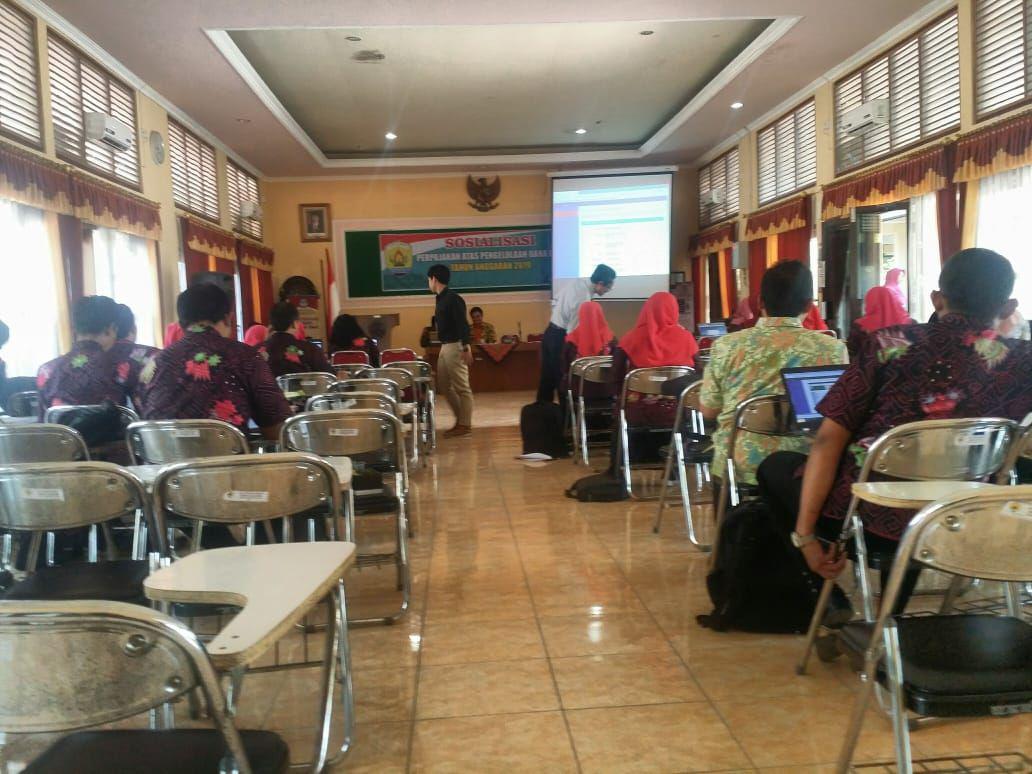 Kegiatan sosialisasi diadakan selama dua hari yaitu pada hari Selasa, 23 Juli 2019 dan hari Kamis, 25 Juli 2019 di ruang Aula Dinas Pendidikan Kabupaten Grobogan dari jam 08.00-15.00 WIB. Pelaksanaan sosialisasi dibagi menjadi dua hari yang berbeda mengingat jumlah peserta cukup banyak sehingga perlu dibuat dalam dua gelombang, dengan pertimbangan materi yang disampaikan bisa lebih efektif. Selain penyampaian materi juga dilakukan praktek secara langsung oleh peserta dengan menggunakan laptop masing-masing untuk pembuatan kode billing. Peserta sosialisasi terdiri dari Bendahara Dana BOS tingkat Sekolah Menengah Pertama (SMP) yang ada di wilayah Kabupaten Grobogan sebanyak 74 orang.