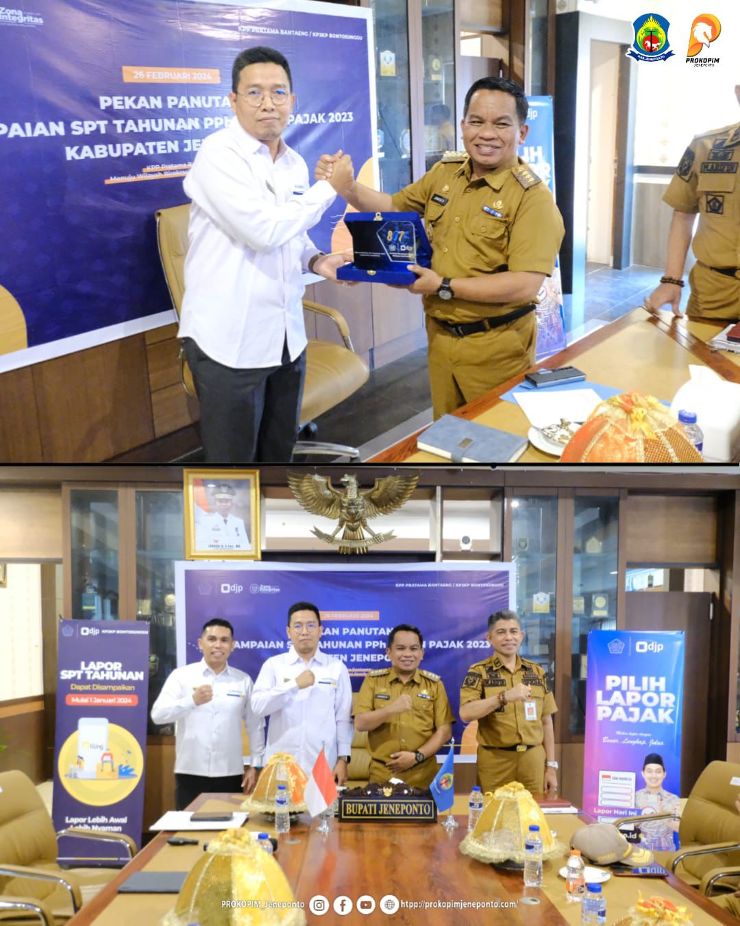 Kantor Pelayanan, Penyuluhan, dan Konsultasi Perpajakan (KP2KP) Bontonsunggu dan Kantor Pelayanan Pajak Pratama Bantaeng menggelar kegiatan Pekan Panutan Bersama Pj Bupati Kabupaten Jeneponto (Senin, 26/2). Dalam kesempatan ini Pj Bupati Kabupaten Jeneponto mengajak seluruh wajib pajak khususnya seluruh pegawai di lingkungan Kabupaten Jeneponto untuk segera melaporkan Surat Pemberitahuan (SPT) Tahunan PPh Orang Pribadi.