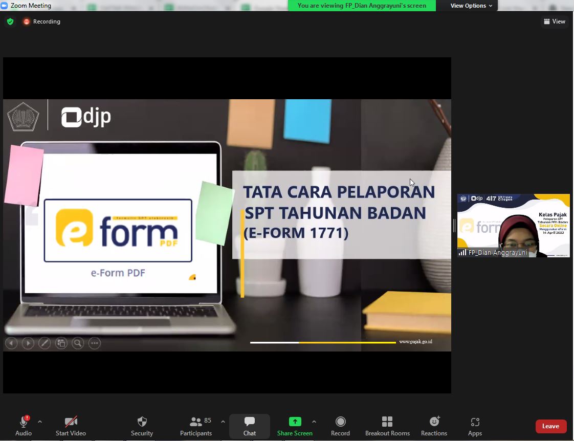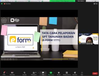 Kantor Pelayanan Pajak (KPP) Pratama Cilegon kembali menyelenggarakan Kelas Pajak dengan tema Pelaporan SPT Tahunan PPh Badan Menggunakan e-Form secara daring melalui aplikasi Zoom Meeting dengan peserta Wajib Pajak Badan KPP Pratama Cilegon di Kota Cilegon (Kamis, 14/4).