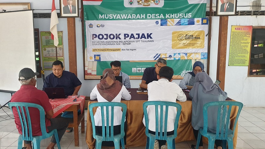 Kantor Pelayanan Pajak (KPP) Karanganyar membuka Pojok Pajak Asistensi Pengisian Surat Pemberitahuan (SPT) Tahunan dan Pemadanan Nomor Induk Kependudukan (NIK) menjadi Nomor Pokok Wajib Pajak (NPWP) di Balai Desa Toyogo, Kecamatan Sambungmacan, Kabupaten Sragen (Rabu, 01/03). Pojok pajak merupakan kerjasama KPP Karanganyar dengan Tax Agent Desa Toyogo. Kegiatan ini dibuka pada pukul 09.00 WIB dan diakhiri pada pukul 13.00 WIB.