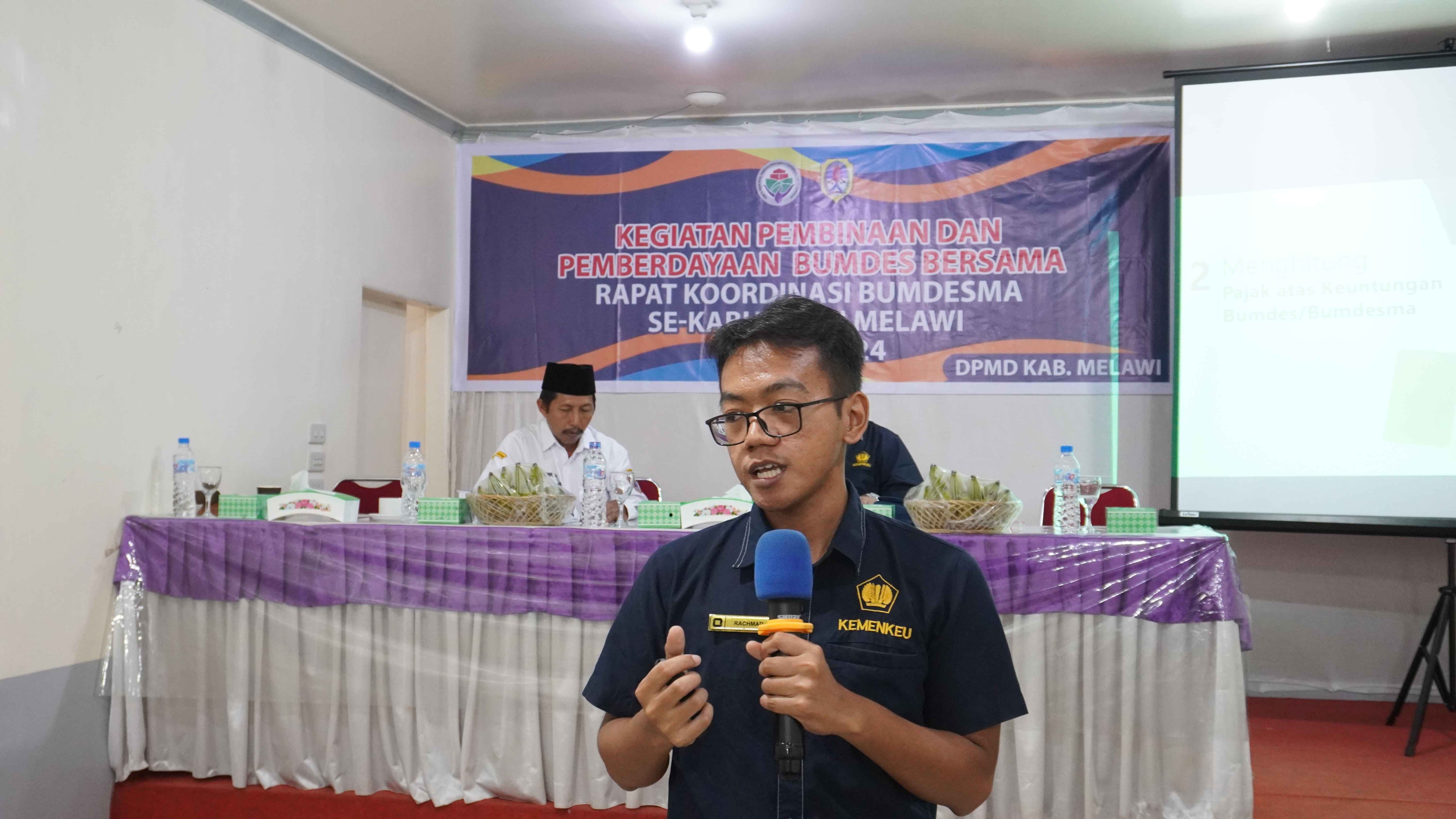 Penyuluh Pajak Kantor Pelayanan, Penyuluhan, dan Konsultasi Perpajakan (KP2KP) Nanga Pinoh mengadakan sosialisasi perpajakan bersama dengan seluruh Pengurus Badan Usaha Milik Desa Bersama (Bumdesma) Kabupaten Melawi di Ruang Aula Hotel Rajawali, Kecamatan Nanga Pinoh, Kabupaten Melawi (Rabu, 26/6).