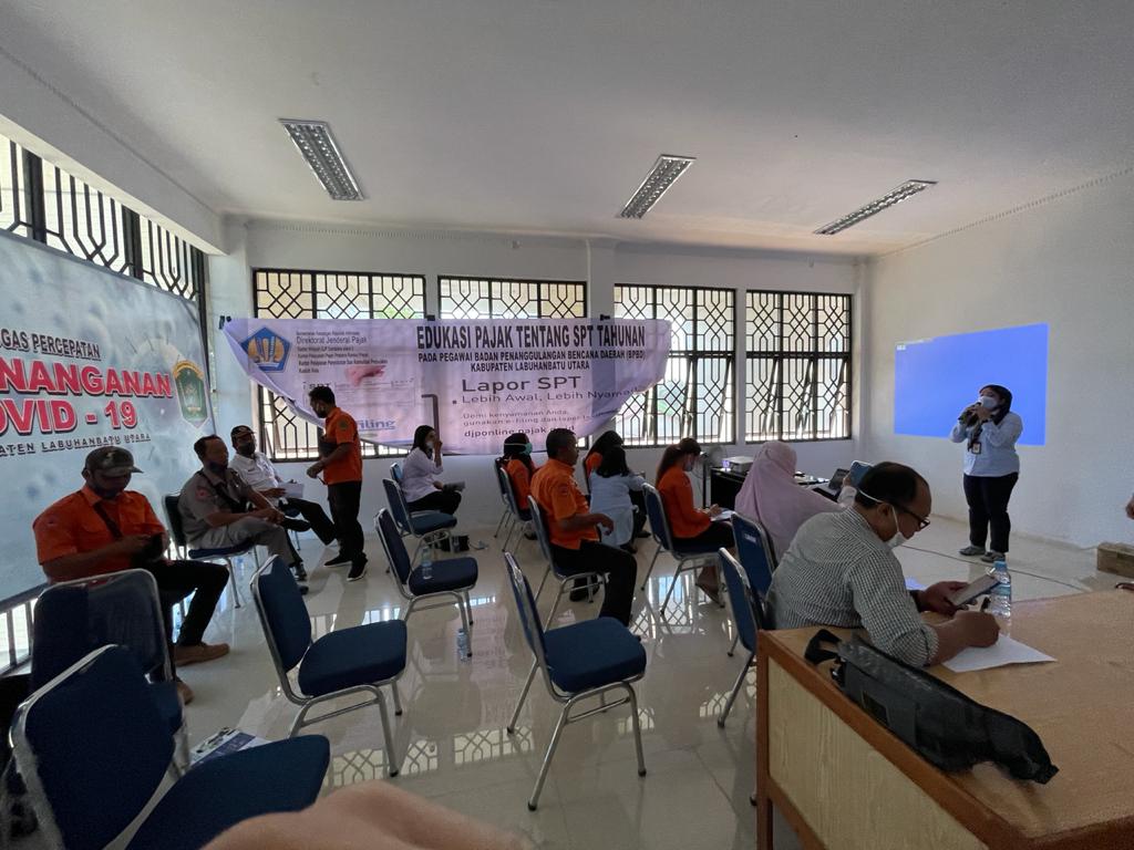 Kantor Pelayanan Pajak (KPP) Pratama Rantau Prapat mengadakan sosialisasi perpajakan kepada pegawai Badan Penanggulangan Bencana Daerah Labuhan Batu Utara di Aula BPBD Labura di Kecamatan Kualuh Selatan Kabupaten Labuhan Batu, Sumatera Utara (Rabu, 27/10).
