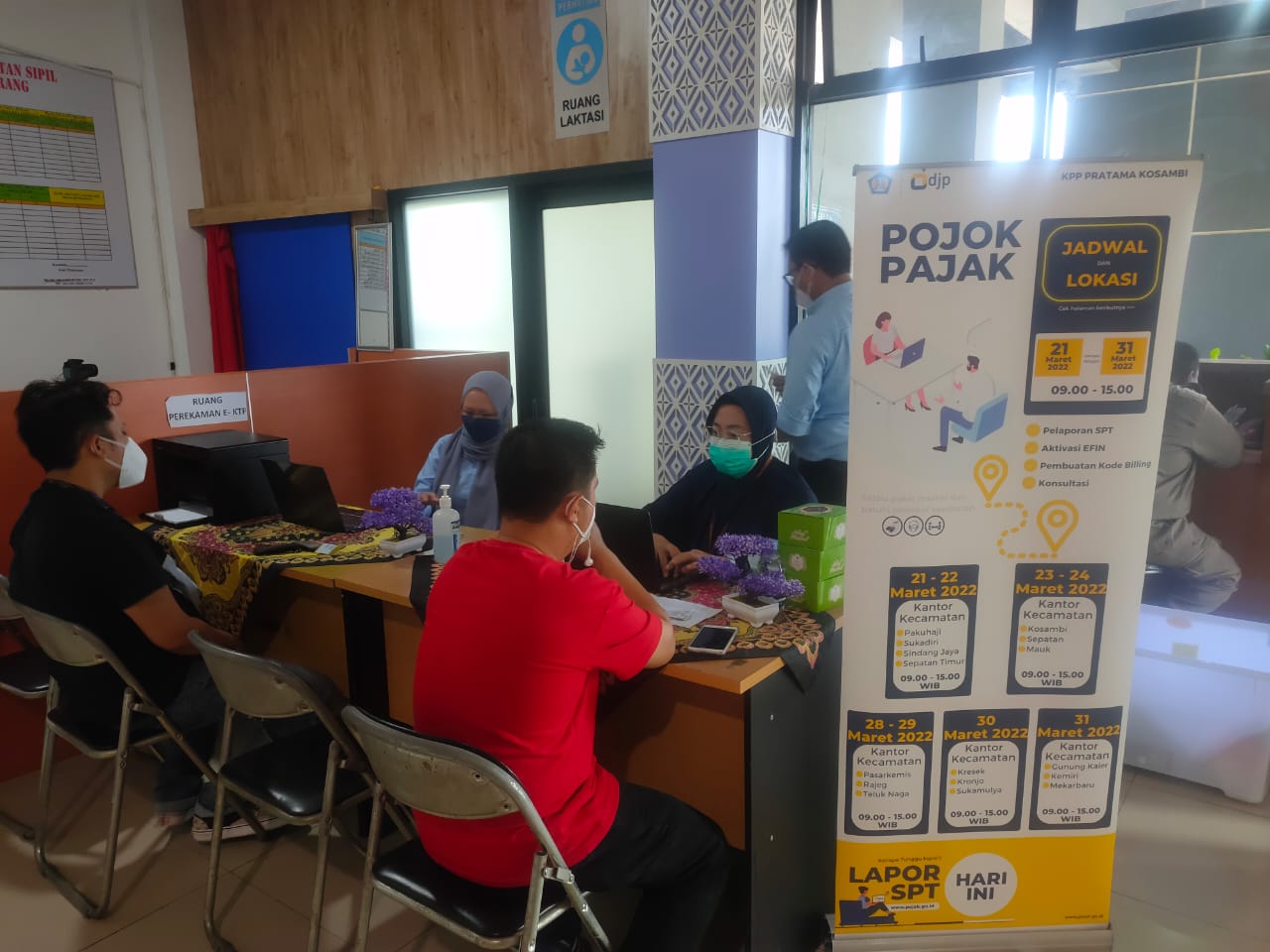 Kantor Pelayanan Pajak (KPP) Pratama Kosambi semakin giat dalam melakukan sosialisasi serta asistensi kepada wajib pajak. Salah satu kegiatannya adalah membuka layanan pojok pajak di 16 (enam belas) kecamatan di Kabupaten Tangerang. Kegiatan ini berlangsung sejak tanggal 21 Maret 2022 hingga 31 Maret 2022 mulai pukul 09.00 WIB sampai dengan 15.00 WIB.