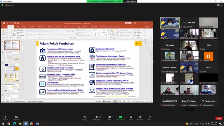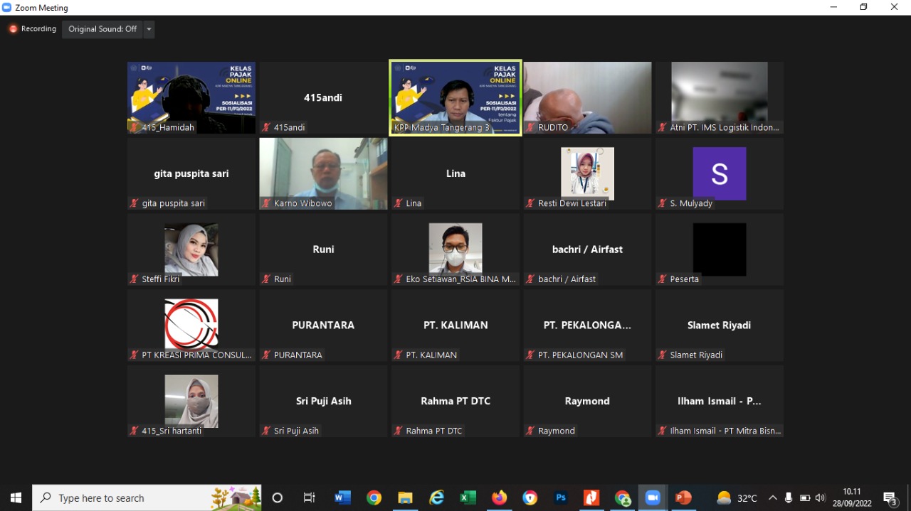 Tim Penyuluh Pajak Kantor Pelayanan Pajak (KPP) Madya Tangerang menyelenggarakan sosialisasi secara daring melalui Zoom Meeting mengenai Per-11/PJ/2022 tentang Faktur Pajak kepada Pengusaha Kena Pajak (PKP) yang terdaftar di KPP Madya Tangerang langsung dari ruang studio KPP Madya Tangerang, Kota Tangerang (Rabu, 28/9).