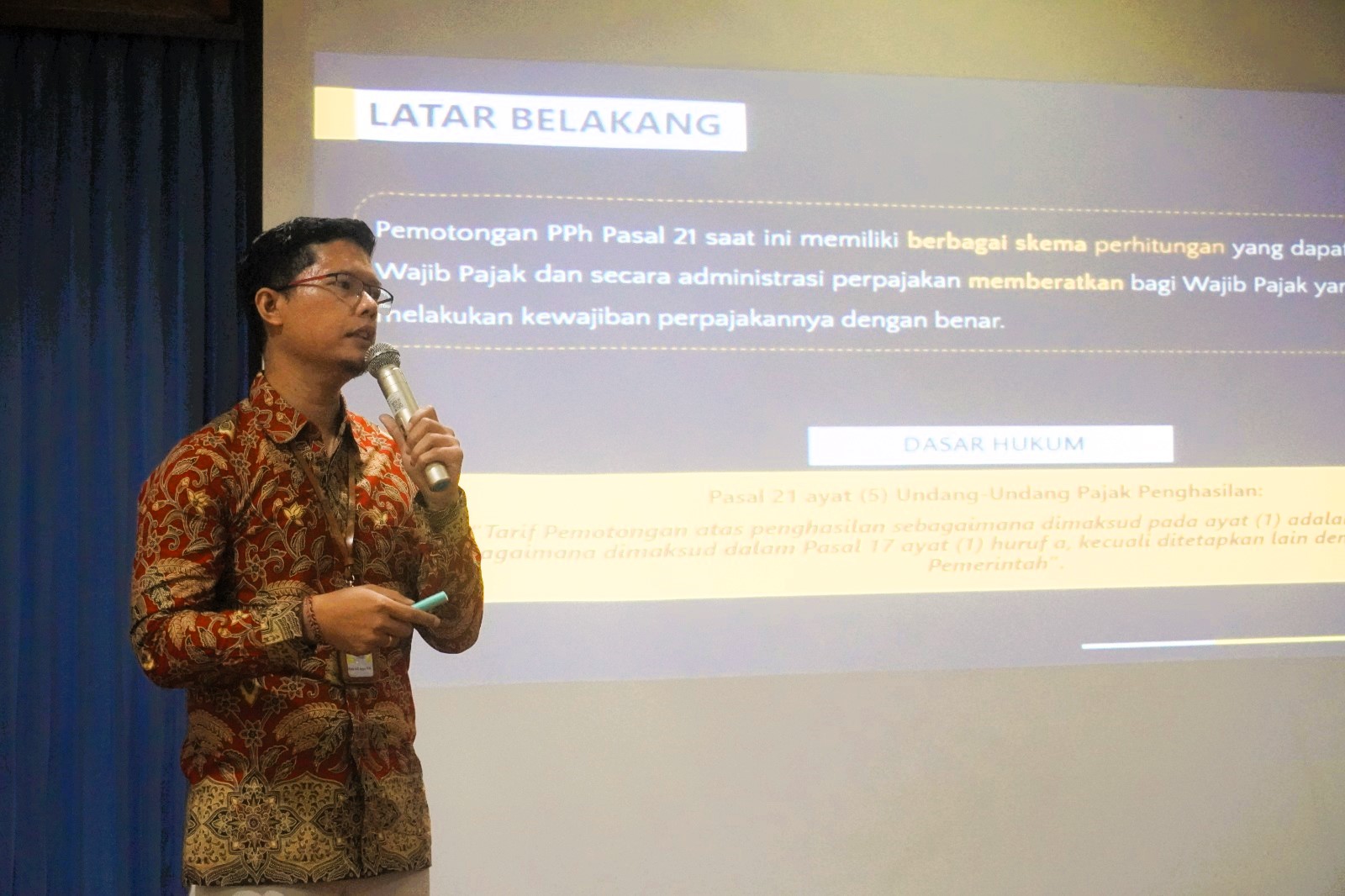 “Bertujuan untuk memberikan kemudahan bagi wajib pajak pemotong pajak (pemberi kerja) dalam melakukan penghitungan atas pemotongan PPh Pasal 21 sehingga dapat menekan kemungkinan salah hitung saat melaksanakan kewajiban perpajakan, memudahkan penerima penghasilan (pegawai) sebagai pihak yang dipotong untuk melakukan pengecekan kebenaran pemotongan PPh atas penghasilannya sehingga dapat tercipta mekanisme check and balance, dan memudahkan pembangunan sistem administrasi perpajakan yang mampu melakukan validasi atas perhitungan wajib pajak, dengan demikian akan terwujud sistem administrasi perpajakan yang efektif, efisien, dan akuntabel yang dapat mendorong terciptanya kepatuhan sukarela,” ungkap Putu Adi Bayu Suteja Sastra saat menyampaikan materi Pedoman Pemotongan PPh Pasal 21 dan TER.