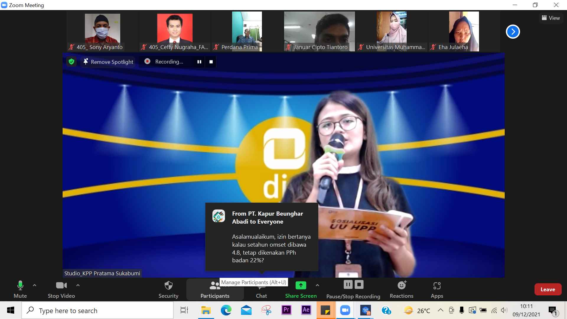 Kantor Pelayanan Pajak (KPP) Pratama Sukabumi menggelar kembali kegiatan Sosialisasi Undang-Undang Harmonisasi Peraturan Perpajakan (UU HPP) secara daring melalui zoom meeting dI Jl. R. E. Martadinata No.1, Gunungparang, Kota Sukabumi (Kamis, 9/12).