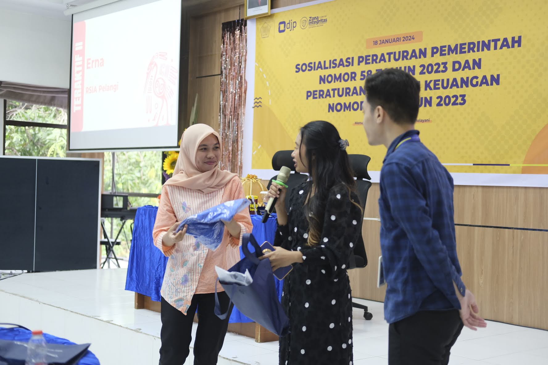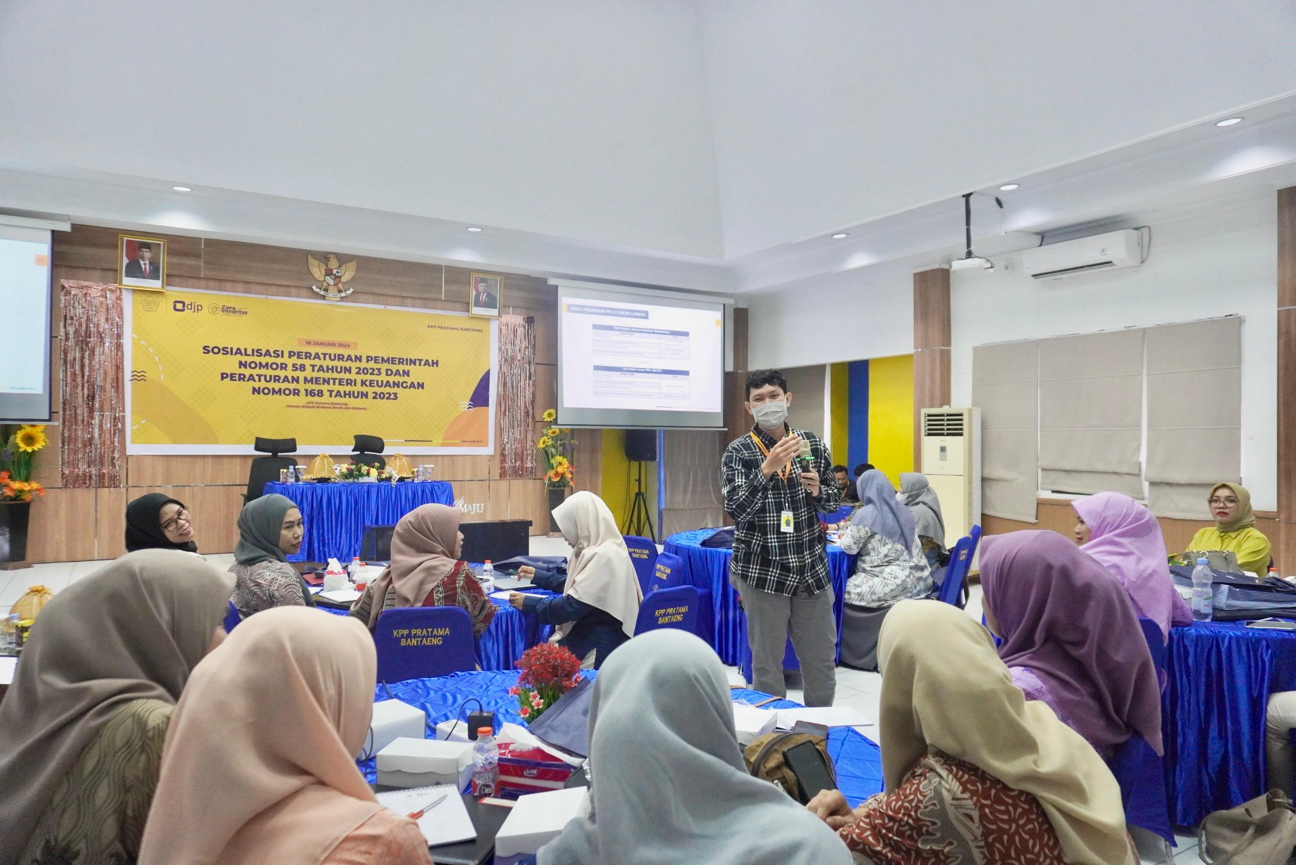 Kantor Pelayanan Pajak (KPP) Pratama Bantaeng menggelar sosialisasi Peraturan Pemerintah (PP) Nomor 58 Tahun 2023 tentang Tarif Pemotongan Pajak Penghasilan Pasal 21 atas Penghasilan Sehubungan dengan Pekerjaan, Jasa, atau Kegiatan Wajib Pajak Orang Pribadi dan Peraturan Menteri Keuangan (PMK) Nomor 168 Tahun 2023 tentang Petunjuk Pelaksanaan Pemotongan Pajak Atas Penghasilan Sehubungan Dengan Pekerjaan, Jasa, Atau Kegiatan Orang Pribadi di Ruang Aula, KPP Bantaeng, Jalan Andi Mannapiang, Lamalaka, Kabupaten Bantaeng (Kamis, 18/1). Acara diadakan dalam rangka mensosialisasikan peraturan terbaru terkait pemotongan Pajak Penghasilan Pasal 21 (PPh 21) Tarif Efektif Rata-Rata (TER) kepada sejumlah Wajib Pajak Fasilitas Kesehatan.