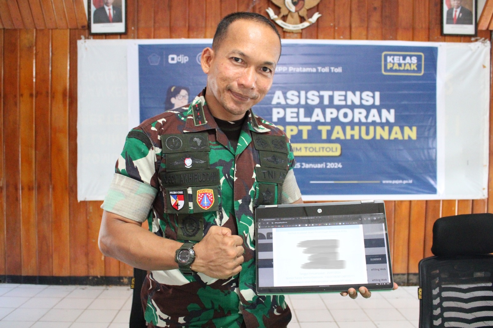 Kantor Pelayanan Pajak (KPP) Pratama Tolitoli memberikan asistensi pelaporan Surat Pemberitahuan (SPT) Tahunan di Aula Distrik Militer (Kodim) 1305 Buol, Tolitoli, Sulawesi Tengah (Kamis, 25/1). Salah satu wajib pajak yang melaporkan adalah Komandan Kodim 1305 Buol Tolitoli, Letkol Inf Dedi Akhiruddin, S.A.P. melalui e-Filing.