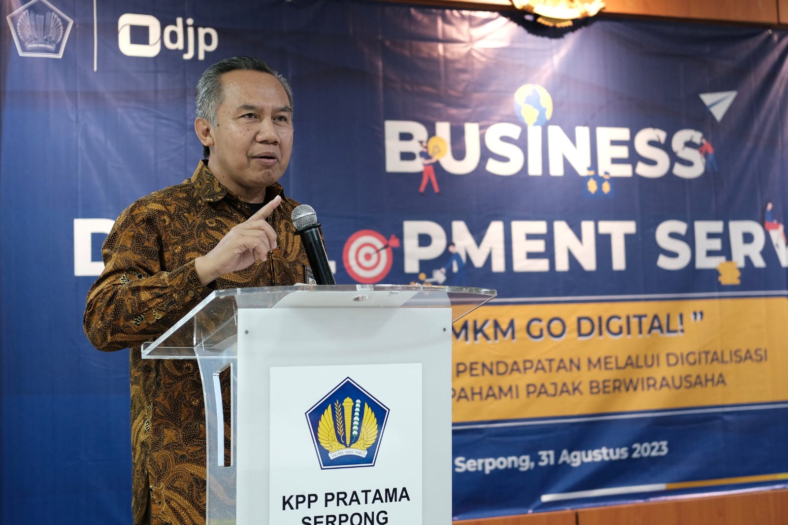 Kanwil DJP Banten bersama 6 Kantor Pelayanan Pajak (KPP) di lingkungan Kanwil DJP Banten menyelenggarakan Business Development Service (BDS) secara hybrid dengan tema UMKM Go Digital Market "Tingkatkan Pendapatan Melalui Digitalisasi Serta Pahami Pajak Berwirausaha" bagi Usaha Mikro, Kecil dan Menengah (UMKM) wilayah Tangerang Selatan, Tangerang dan Pandeglang di Aula KPP Pratama Serpong, Jalan Raya Serpong Sektor VIII, Lengkong Gudang, Kecamatan Serpong, Tangerang, Banten (Kamis, 31/8).